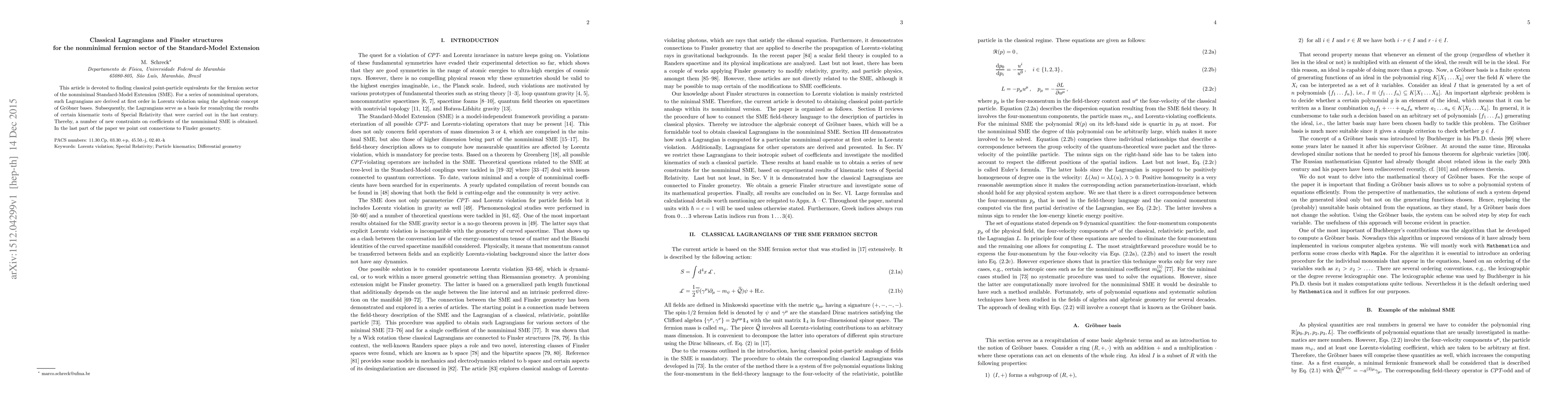This paper derives classical Lagrangians for the nonminimal fermion sector of the Standard-Model Extension at first order in Lorentz violation using Gröbner bases. It reanalyzes kinematic tests of Special Relativity to obtain new constraints on nonminimal SME coefficients and connects these findings to Finsler geometry.