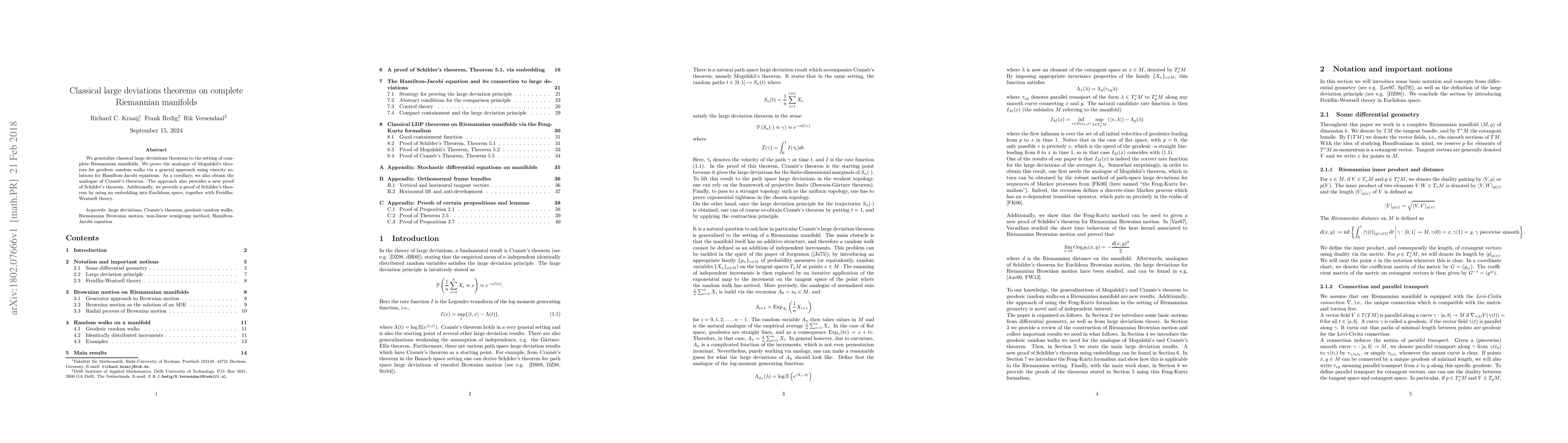 This paper generalizes classical large deviations theorems to complete Riemannian manifolds, proving analogues of Mogulskii's and Cramér's theorems using viscosity solutions for Hamilton-Jacobi equations, and providing new proofs for Schilder's theorem via both this method and an embedding into Euclidean space with Freidlin-Wentzell theory.