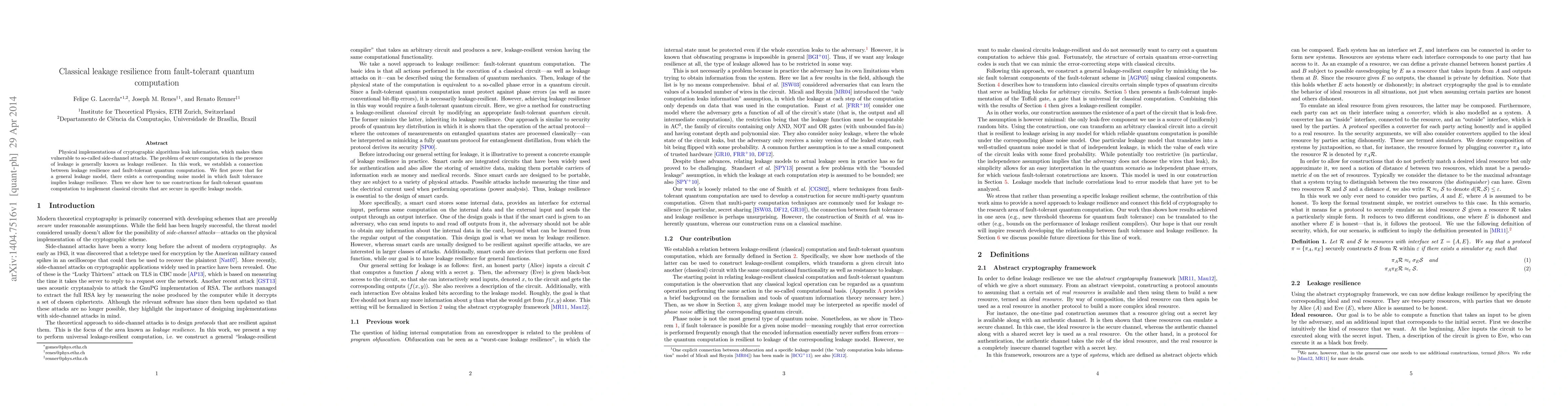 Physical implementations of cryptographic algorithms leak information, which makes them vulnerable to so-called side-channel attacks. The problem of secure computation in the presence of leakage is generally known as leakage resilience. In this work, we establish a connection between leakage resilience and fault-tolerant quantum computation. We first prove that for a general leakage model, there exists a corresponding noise model in which fault tolerance implies leakage resilience. Then we show how to use constructions for fault-tolerant quantum computation to implement classical circuits that are secure in specific leakage models.