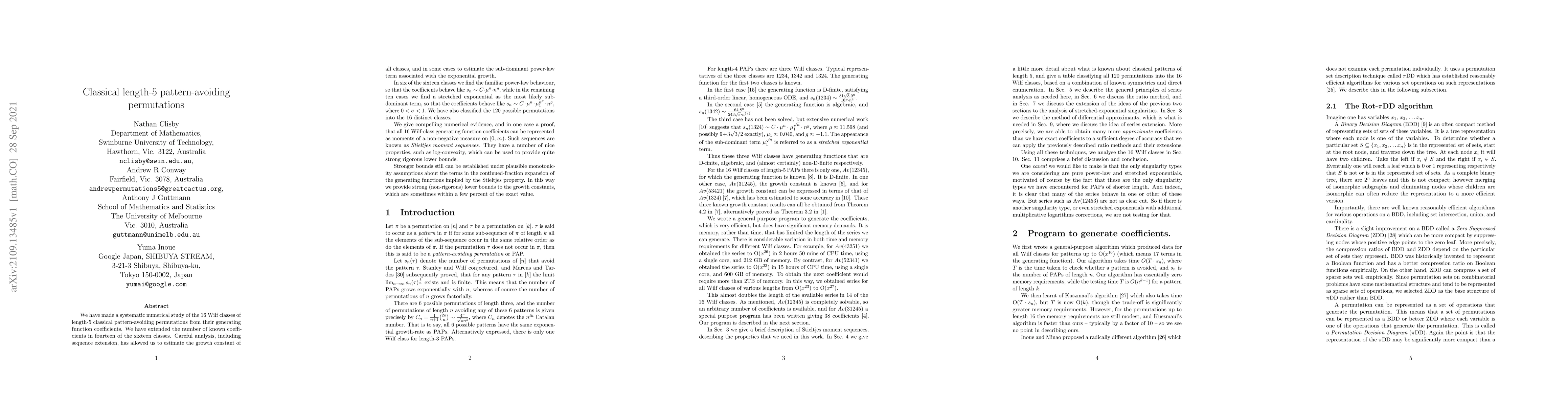 This paper systematically studies the 16 Wilf classes of length-5 pattern-avoiding permutations, extending the known coefficients and estimating growth constants. The authors find that six classes exhibit power-law growth, while ten show stretched exponential growth, and provide evidence that all generating functions can be represented as Stieltjes moment sequences.