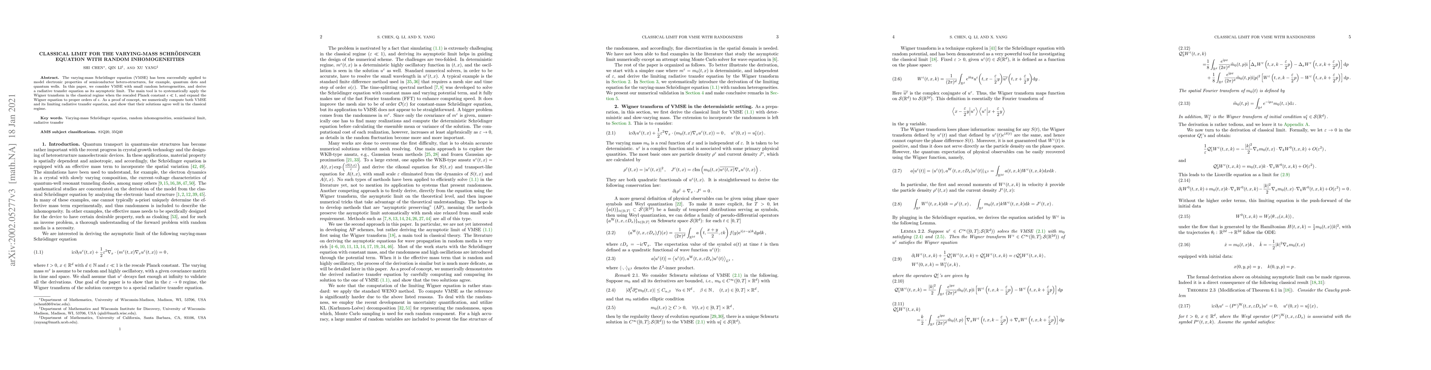 The varying-mass Schr\"odinger equation (VMSE) has been successfully applied to model electronic properties of semiconductor hetero-structures, for example, quantum dots and quantum wells. In this paper, we consider VMSE with small random heterogeneities, and derive a radiative transfer equation as its asymptotic limit. The main tool is to systematically apply the Wigner transform in the classical regime when the rescaled Planck constant $\epsilon\ll 1$, and expand the Wigner equation to proper orders of $\epsilon$. As a proof of concept, we numerically compute both VMSE and its limiting radiative transfer equation, and show that their solutions agree well in the classical regime.