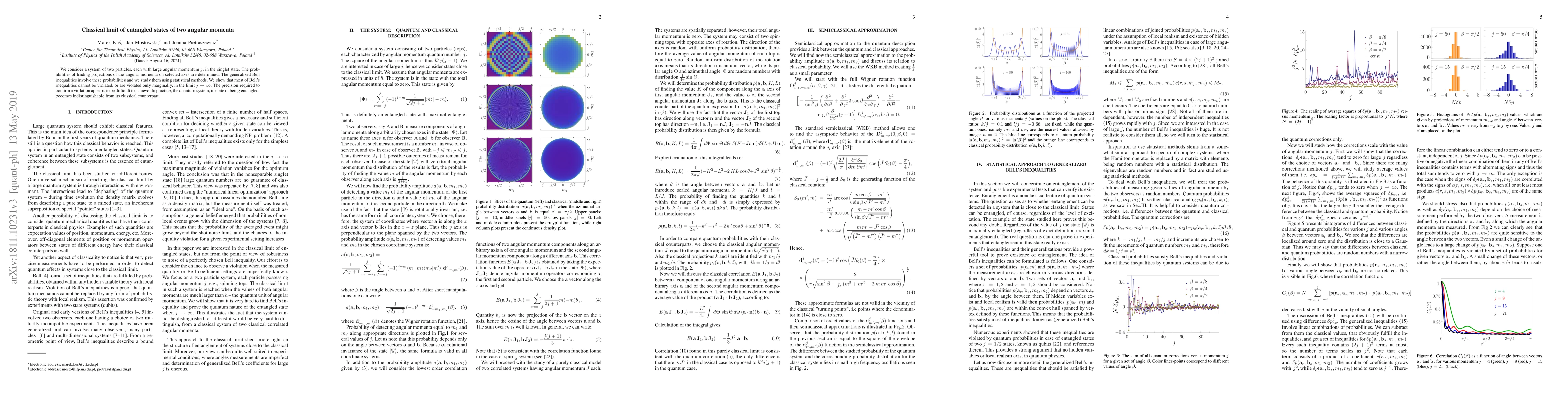 We consider a system of two particles, each with large angular momentum $j$, in the singlet state. The probabilities of finding projections of the angular momenta on selected axes are determined. The generalized Bell inequalities involve these probabilities and we study them using statistical methods. We show that most of Bells inequalities cannot be violated, or are violated only marginally, in the limit $j\to \infinity$. The precision required to confirm a violation appears to be difficult to achieve. In practice, the quantum system, in spite of being entangled, becomes indistinguishable from its classical counterpart.