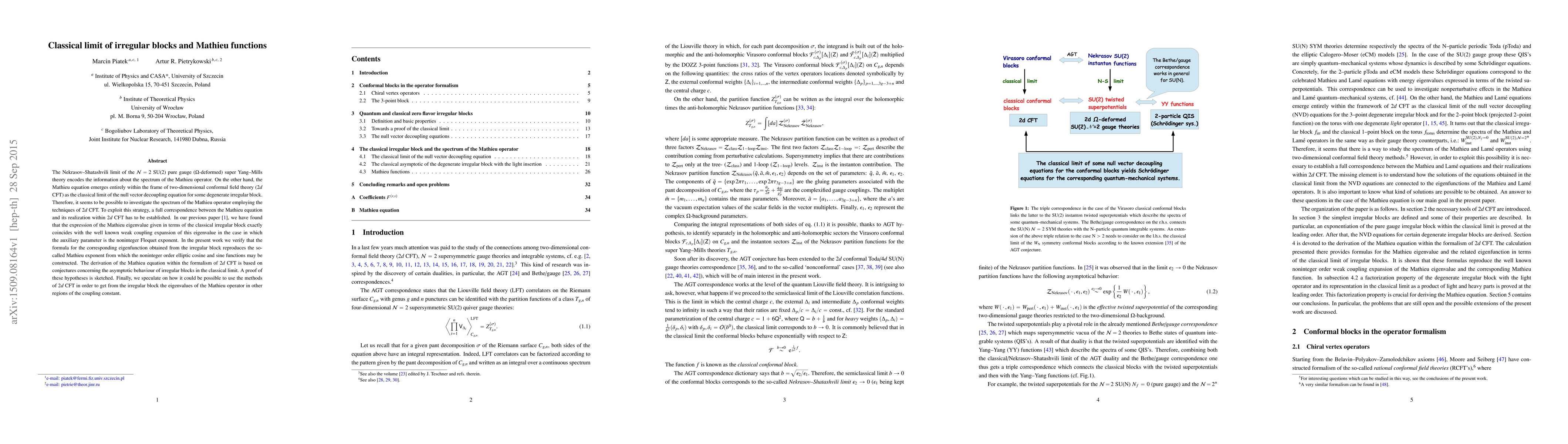 This paper explores the connection between the Nekrasov-Shatashvili limit of N=2 SU(2) gauge theory and the Mathieu operator via irregular blocks in 2d CFT. It verifies that the eigenfunction formula from irregular blocks matches the Mathieu equation's exponent, linking it to elliptic cosine and sine functions. The methodology relies on conjectures about irregular blocks' asymptotic behavior in the classical limit, with a sketched proof. The implication is the potential use of 2d CFT methods to find Mathieu operator eigenvalues in other coupling constant regions.