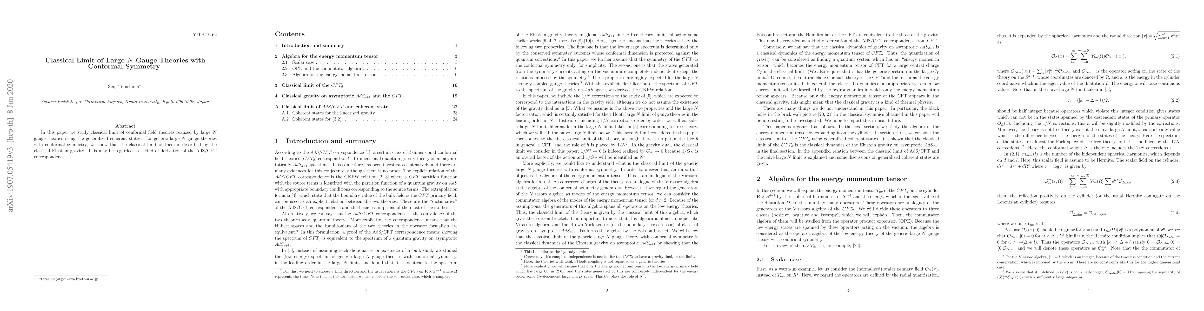 This paper investigates the classical limit of large N gauge theories with conformal symmetry, demonstrating that it corresponds to classical Einstein gravity, thus providing a derivation of the AdS/CFT correspondence using generalized coherent states.