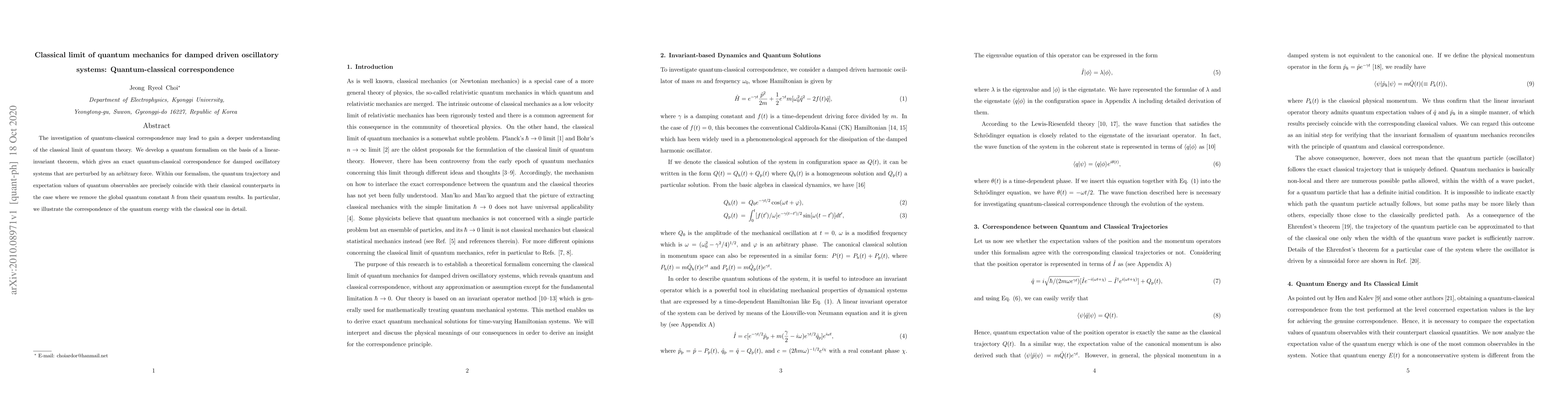 This paper develops a quantum formalism that provides an exact correspondence between quantum and classical mechanics for damped driven oscillatory systems, demonstrating that quantum trajectories and observable expectations converge to their classical counterparts when the quantum constant h is removed. The study highlights the detailed correspondence between quantum and classical energy.