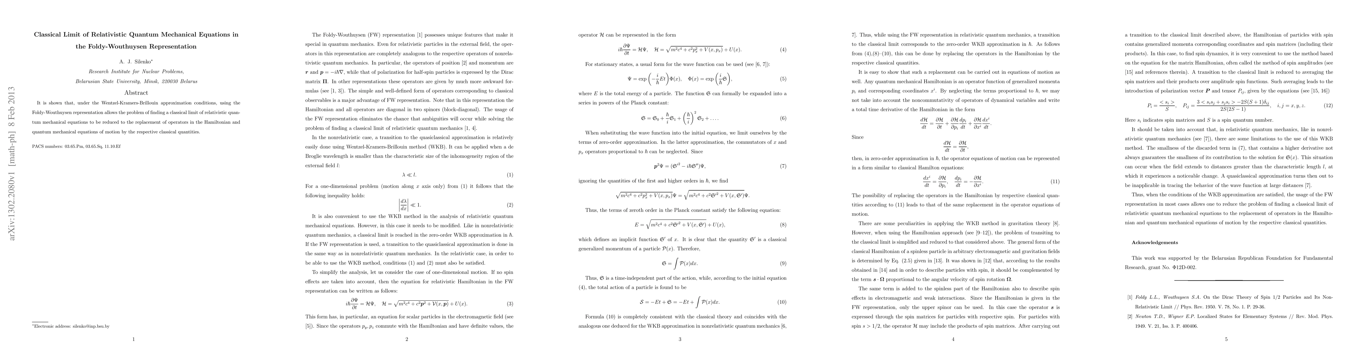 It is shown that, under the Wentzel-Kramers-Brillouin approximation conditions, using the Foldy-Wouthuysen representation allows the problem of finding a classical limit of relativistic quantum mechanical equations to be reduced to the replacement of operators in the Hamiltonian and quantum mechanical equations of motion by the respective classical quantities.