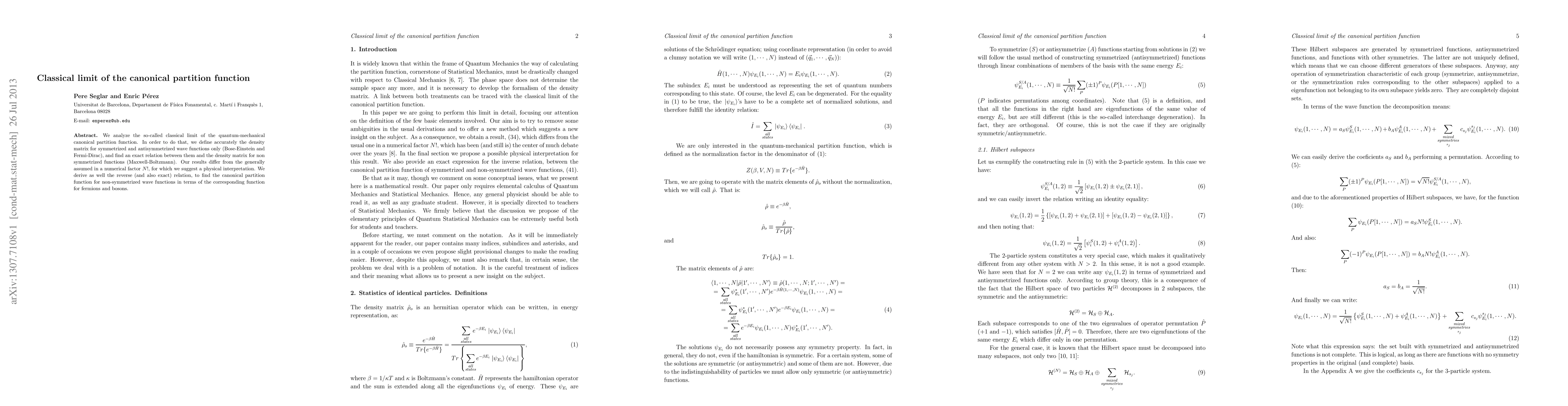 This paper investigates the classical limit of the quantum-mechanical canonical partition function, deriving exact relations between symmetrized and non-symmetrized density matrices. It proposes a new interpretation for the numerical factor N! and provides a reverse relation for the canonical partition function.