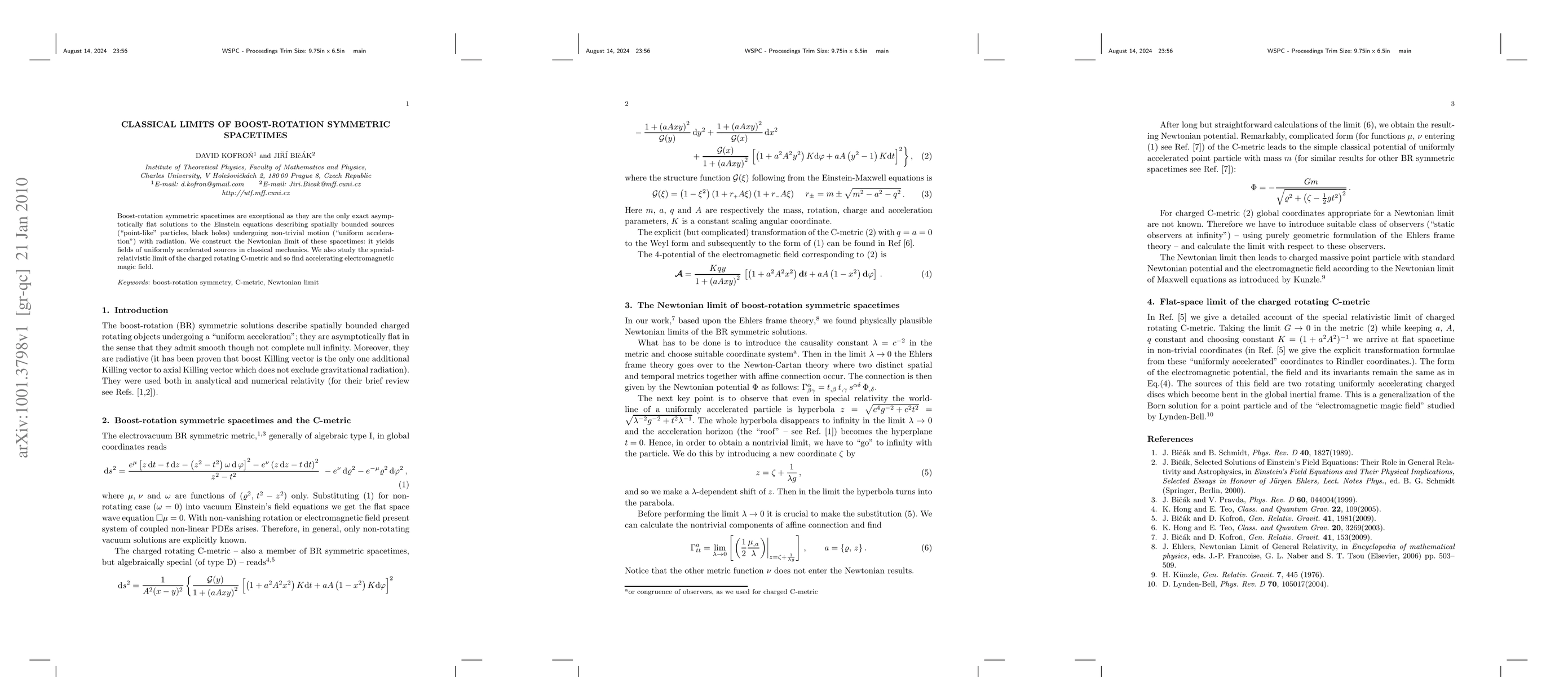 This paper explores boost-rotation symmetric spacetimes, which are unique exact solutions to Einstein's equations for spatially bounded sources in non-trivial motion. It constructs the Newtonian limit, revealing fields of uniformly accelerated sources in classical mechanics, and examines the special-relativistic limit of the charged rotating C-metric, uncovering an accelerating electromagnetic field.