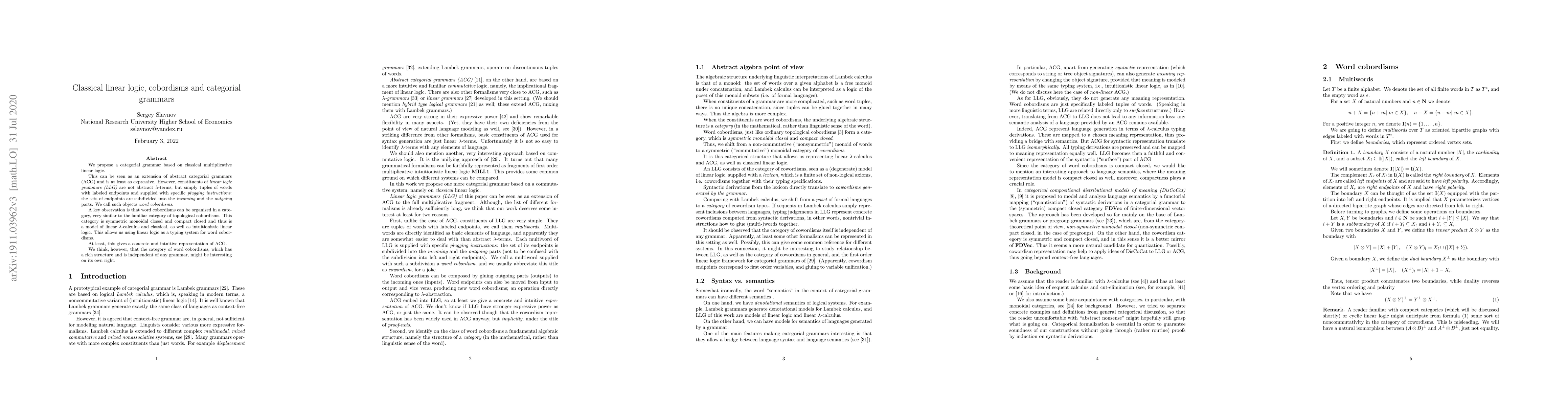 This paper proposes a categorial grammar based on classical multiplicative linear logic, termed linear logic grammars (LLG), which uses word cobordisms as constituents instead of abstract λ-terms. The category of word cobordisms mirrors topological cobordisms, providing a model for linear λ-calculus and linear logic, offering a concrete representation of abstract categorial grammars.