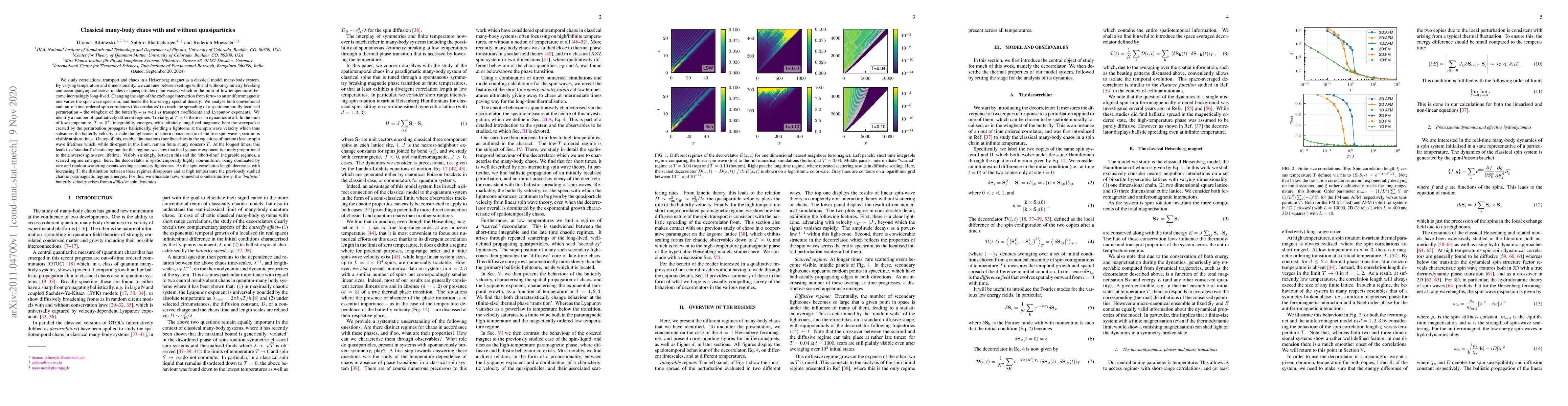 The research investigates a Heisenberg magnet as a classical many-body system, examining correlations, transport, and chaos through varying temperature and dimensionality. Key findings include distinct regimes from trivial (no dynamics at T=0) to low-temperature integrable (ballistic propagation with magnons), a scarred regime (spatiotemporally non-uniform decorrelator), and high-temperature chaotic paramagnetic regime. The study reveals that the butterfly velocity is linked to spin-wave lifetimes and emergence of diffusive spin dynamics at high temperatures.