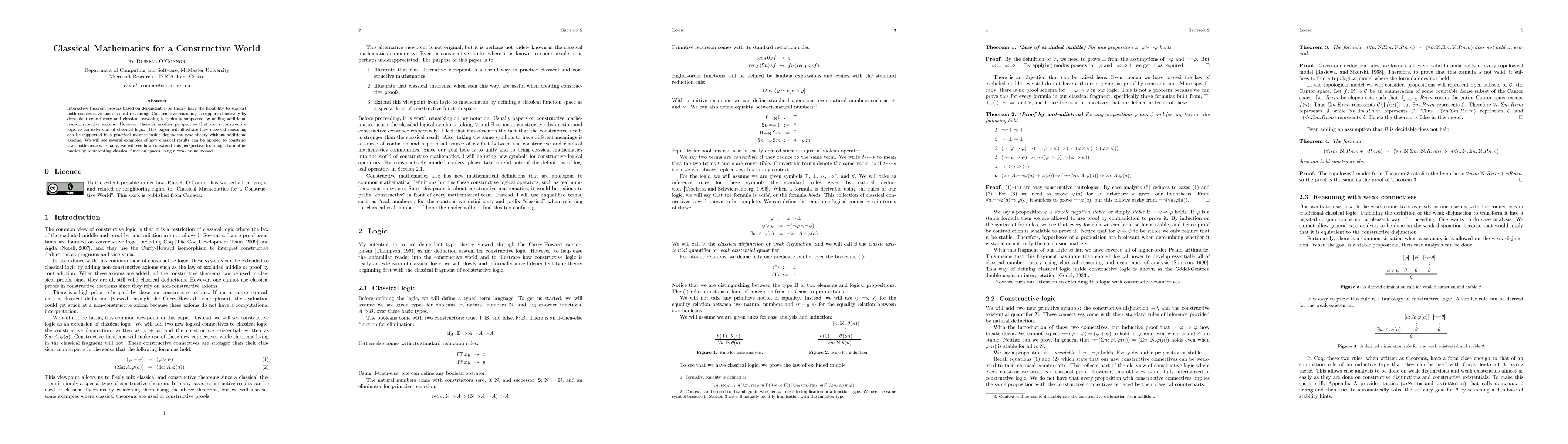 Interactive theorem provers based on dependent type theory have the flexibility to support both constructive and classical reasoning. Constructive reasoning is supported natively by dependent type theory and classical reasoning is typically supported by adding additional non-constructive axioms. However, there is another perspective that views constructive logic as an extension of classical logic. This paper will illustrate how classical reasoning can be supported in a practical manner inside dependent type theory without additional axioms. We will see several examples of how classical results can be applied to constructive mathematics. Finally, we will see how to extend this perspective from logic to mathematics by representing classical function spaces using a weak value monad.