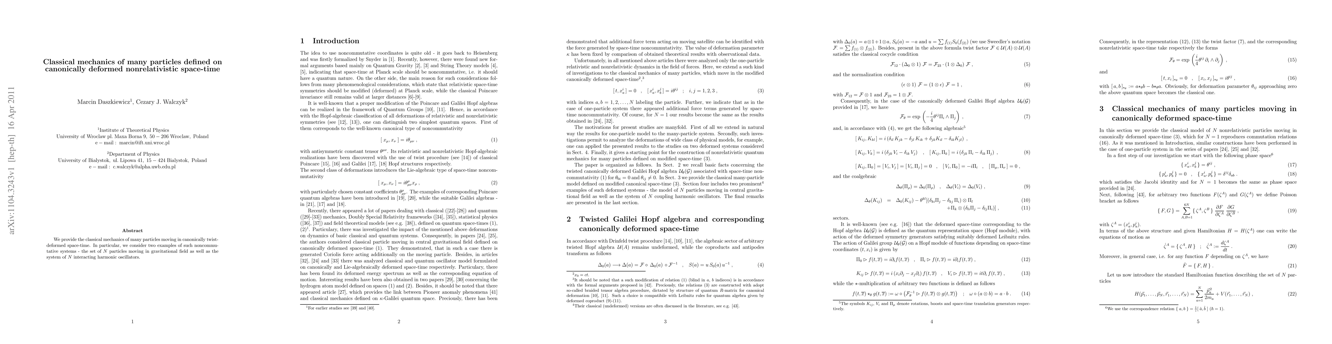 Summary: This paper develops the classical mechanics for many particles in canonically deformed nonrelativistic space-time, focusing on two noncommutative systems: N particles in a gravitational field and N interacting harmonic oscillators. The study highlights the implications of twist-deformed space-time on these systems.