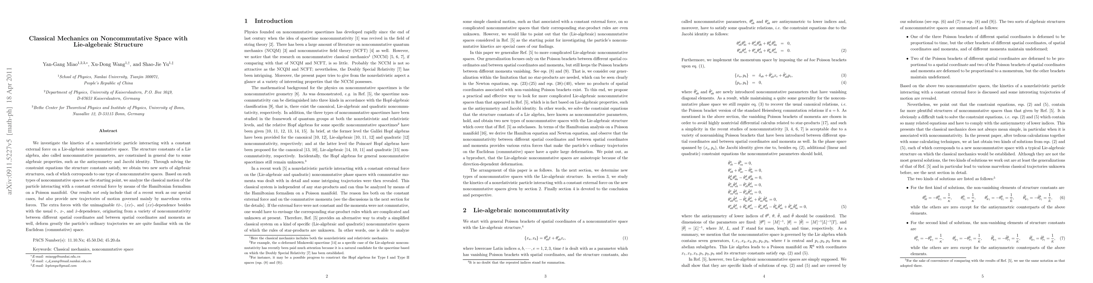 We investigate the kinetics of a nonrelativistic particle interacting with a constant external force on a Lie-algebraic noncommutative space. The structure constants of a Lie algebra, also called noncommutative parameters, are constrained in general due to some algebraic properties, such as the antisymmetry and Jacobi identity. Through solving the constraint equations the structure constants satisfy, we obtain two new sorts of algebraic structures, each of which corresponds to one type of noncommutative spaces. Based on such types of noncommutative spaces as the starting point, we analyze the classical motion of the particle interacting with a constant external force by means of the Hamiltonian formalism on a Poisson manifold. Our results {\em not only} include that of a recent work as our special cases, {\em but also} provide new trajectories of motion governed mainly by marvelous extra forces. The extra forces with the unimaginable $t\dot{x}$-, $\dot{(xx)}$-, and $\ddot{(xx)}$-dependence besides with the usual $t$-, $x$-, and $\dot{x}$-dependence, originating from a variety of noncommutativity between different spatial coordinates and between spatial coordinates and momenta as well, deform greatly the particle's ordinary trajectories we are quite familiar with on the Euclidean (commutative) space.