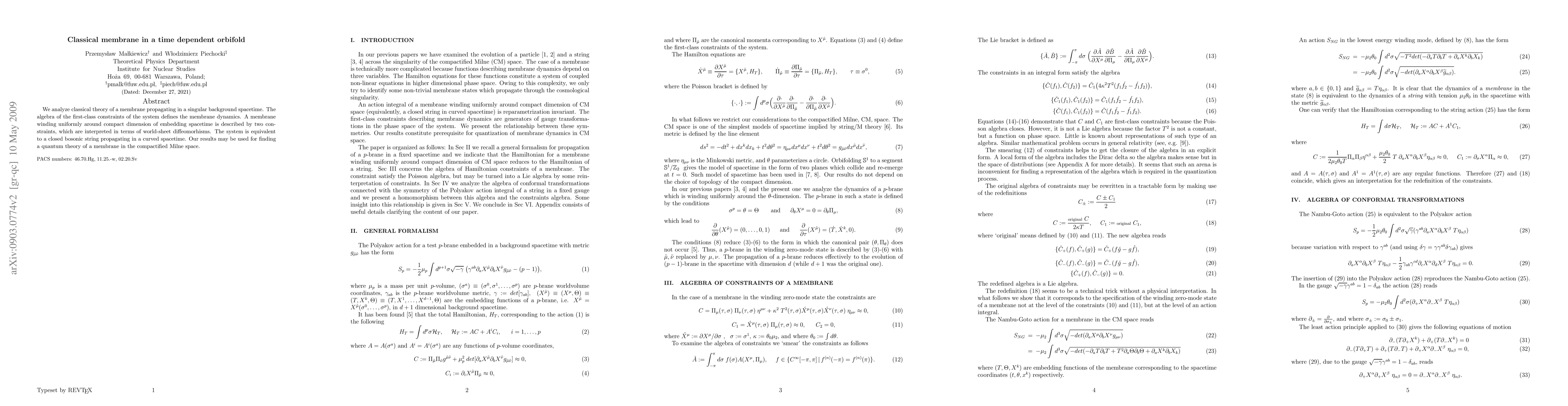We analyze classical theory of a membrane propagating in a singular background spacetime. The algebra of the first-class constraints of the system defines the membrane dynamics. A membrane winding uniformly around compact dimension of embedding spacetime is described by two constraints, which are interpreted in terms of world-sheet diffeomorhisms. The system is equivalent to a closed bosonic string propagating in a curved spacetime. Our results may be used for finding a quantum theory of a membrane in the compactified Milne space.