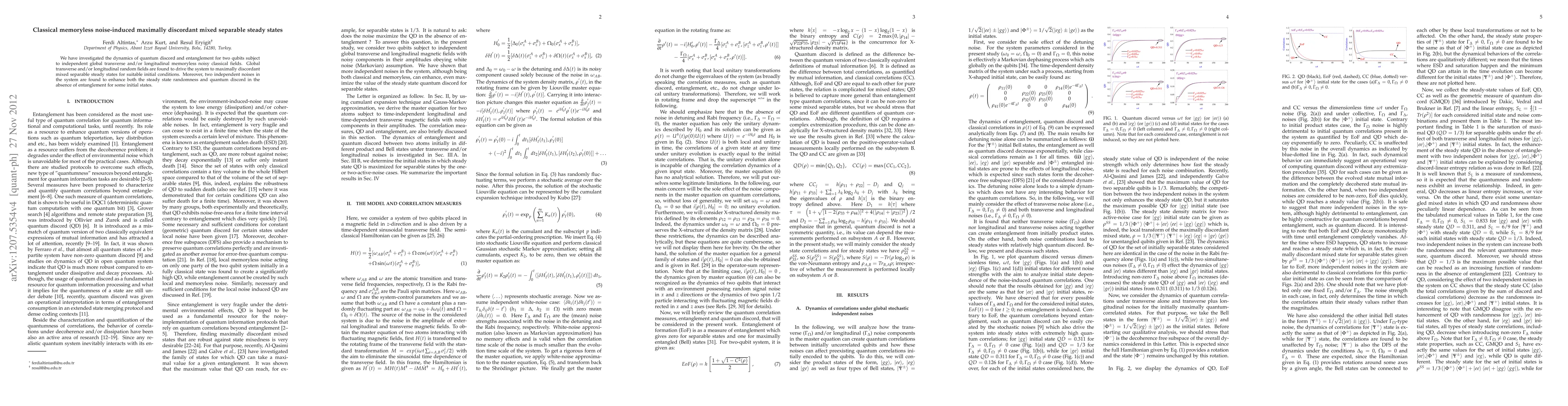 This paper explores the dynamics of quantum discord and entanglement in two qubits under independent memoryless classical noise, revealing that such noise can drive the system to maximally discordant mixed separable steady states, with dual noise enhancing randomness and discord without entanglement for certain initial conditions.