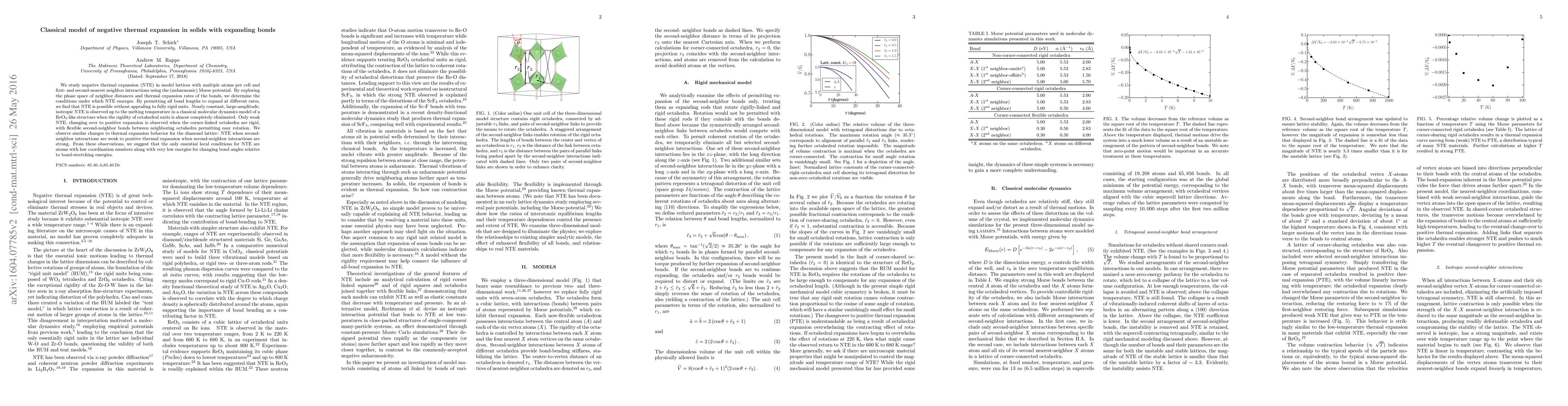 We study negative thermal expansion (NTE) in model lattices with multiple atoms per cell and first- and second-nearest neighbor interactions using the (anharmonic) Morse potential. By exploring the phase space of neighbor distances and thermal expansion rates of the bonds, we determine the conditions under which NTE emerges. By permitting all bond lengths to expand at different rates, we find that NTE is possible without appealing to fully rigid units. Nearly constant, large-amplitude, isotropic NTE is observed up to the melting temperature in a classical molecular dynamics model of a $\mathrm{ReO}_3$-like structure when the rigidity of octahedral units is almost completely eliminated. Only weak NTE, changing over to positive expansion is observed when the corner-linked octahedra are rigid, with flexible second-neighbor bonds between neighboring octahedra permitting easy rotation. We observe similar changes to thermal expansion behavior for the diamond lattice: NTE when second-neighbor interactions are weak to positive thermal expansion when second-neighbor interactions are strong. From these observations, we suggest that the only essential local conditions for NTE are atoms with low coordination numbers along with very low energies for changing bond angles relative to bond-stretching energies.