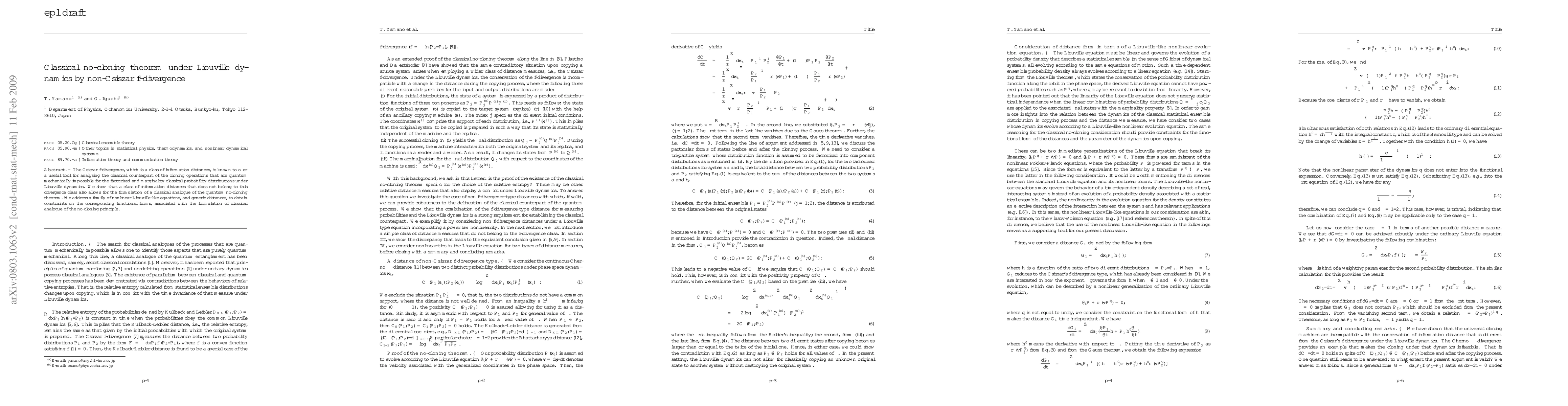 This paper explores the classical no-cloning theorem using non-Csiszár f-divergences, demonstrating that a broader class of information distances can formulate a classical analogue of the quantum no-cloning principle. It also investigates nonlinear Liouville-like equations and generic distances to derive constraints on functional forms related to the classical no-cloning theorem.