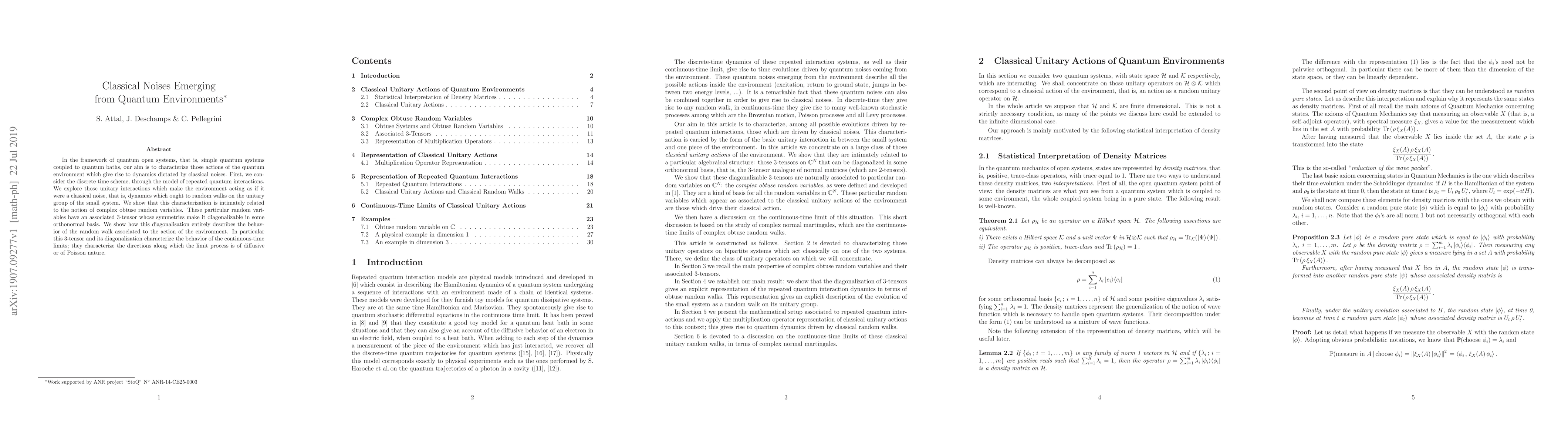 In the framework of quantum open systems, that is, simple quantum systems coupled to quantum baths, our aim is to characterize those actions of the quantum environment which give rise to dynamics dictated by classical noises. First, we consider the discrete time scheme, through the model of repeated quantum interactions. We explore those unitary interactions which make the environment acting as if it were a classical noise, that is, dynamics which ought to random walks on the unitary group of the small system. We show that this characterization is intimately related to the notion of complex obtuse random variables. These particular random variables have an associated 3-tensor whose symmetries make it diagonalizable in some orthonormal basis. We show how this diagonalisation entirely describes the behavior of the random walk associated to the action of the environment. In particular this 3-tensor and its diagonalization characterize the behavior of the continuous-time limits; they characterize the directions along which the limit process is of diffusive or of Poisson nature.