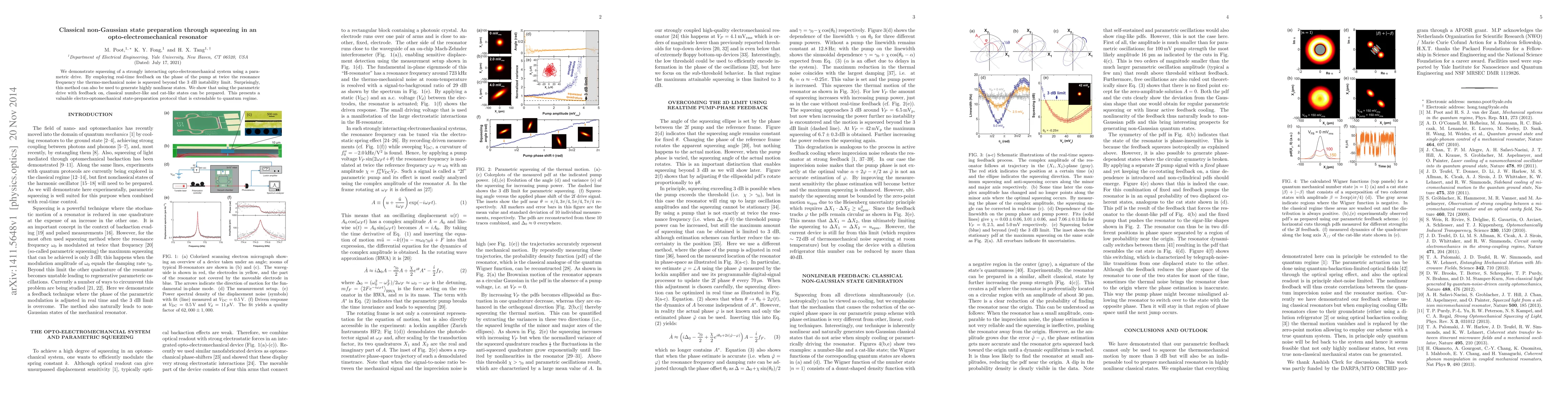 This paper demonstrates the preparation of classical non-Gaussian states in an opto-electromechanical resonator through squeezing, utilizing a parametric drive and real-time feedback to surpass the 3 dB instability limit and generate number-like and cat-like states. This method offers a scalable electro-optomechanical protocol extendible to quantum state preparation.