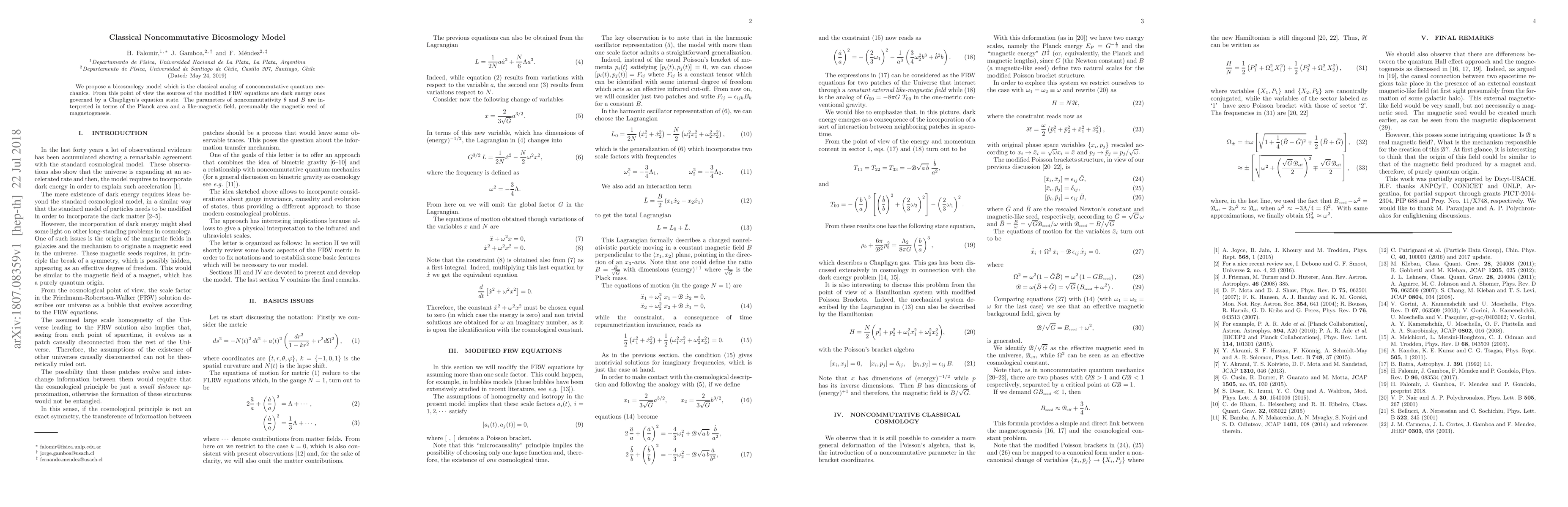 We propose a bicosmology model which is the classical analog of noncommutative quantum mechanics. From this point of view the sources of the modified FRW equations are dark energy ones governed by a Chapligyn's equation state. The parameters of noncommutativity $\theta$ and $B$ are interpreted in terms of the Planck area and a like-magnetic field, presumably the magnetic seed of magnetogenesis.