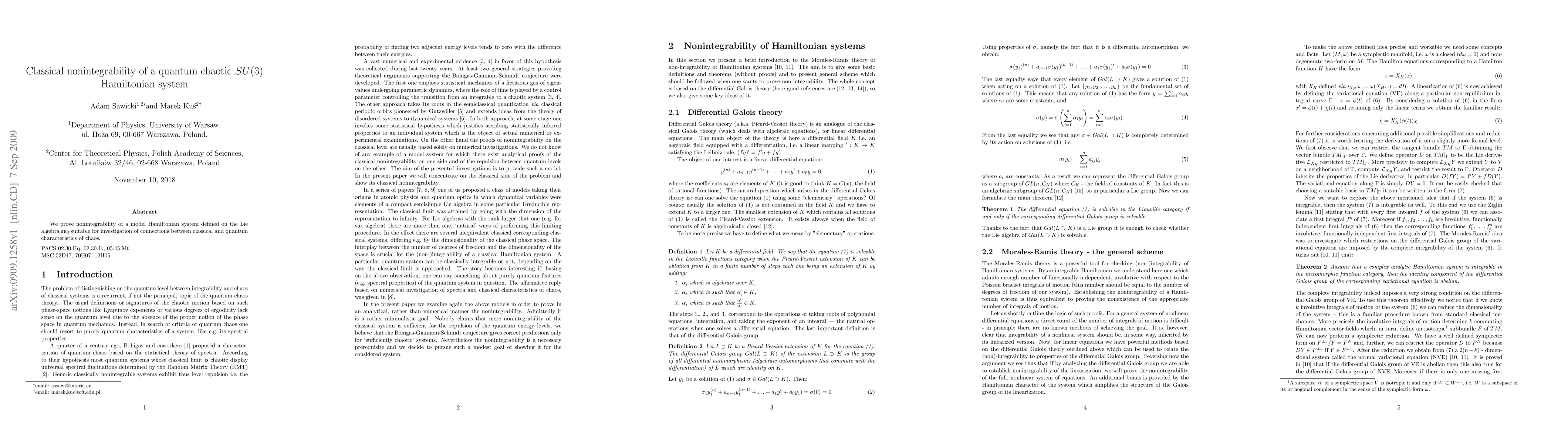 Summary: This paper demonstrates nonintegrability of a classical Hamiltonian system based on the $\mathfrak{su}_3$ Lie algebra, establishing a foundation for exploring the relationship between classical and quantum chaos. The study confirms the presence of chaotic behavior in both classical and quantum contexts.