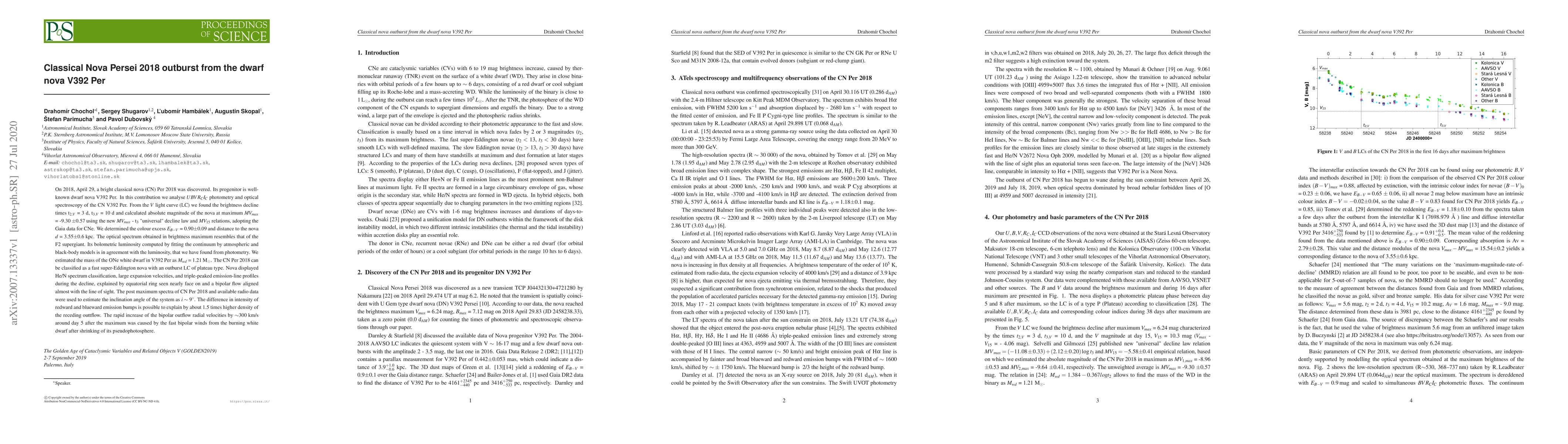 On 2018, April 29, a bright classical nova (CN) Per 2018 was discovered. Its progenitor is a well-known dwarf nova V392 Per. In this contribution, we analyze $UBVR_{C}I_{C}$ photometry and optical spectroscopy of the CN V392 Per. From the $V$ light curve (LC) we found the brightness decline times t$_{2,V}$ = 3 d, t$_{3,V}$ = 10 d and calculated absolute magnitude of the nova at maximum $MV_{max}$ = -9.30 ${\pm}$0.57 using the new $MV_{max}$ - t$_{3}$ "universal" decline law and $MV_{15}$ relations, adopting the Gaia data for CNe. We determined the colour excess $E_{B-V}$ = 0.90$\pm$0.09 and distance to the nova $d$ = 3.55$\pm$0.6 kpc. The optical spectrum obtained in brightness maximum resembles that of the F2 supergiant. Its bolometric luminosity computed by fitting the continuum by atmospheric and black-body models is in agreement with the luminosity, that we have found from photometry. We estimated the mass of the ONe white dwarf in V392 Per as $M_{wd}$ = 1.21 M$_{\odot}$. The CN Per 2018 can be classified as a fast super-Eddington nova with an outburst LC of plateau type. Nova displayed He/N spectrum classification, large expansion velocities, and triple-peaked emission-line profiles during the decline, explained by equatorial ring seen nearly face on and a bipolar flow aligned almost with the line of sight. The post maximum spectra of CN Per 2018 and available radio data were used to estimate the inclination angle of the system as $i\sim$ 9$^{\circ}$. The difference in intensity of redward and blueward emission bumps is possible to explain by about 1.5 times higher density of the receding outtflow. The rapid increase of the bipolar outflow radial velocities by $\sim$300 km/s around day 5 after the maximum was caused by the fast bipolar winds from the burning white dwarf after shrinking of its pseudophotosphere.