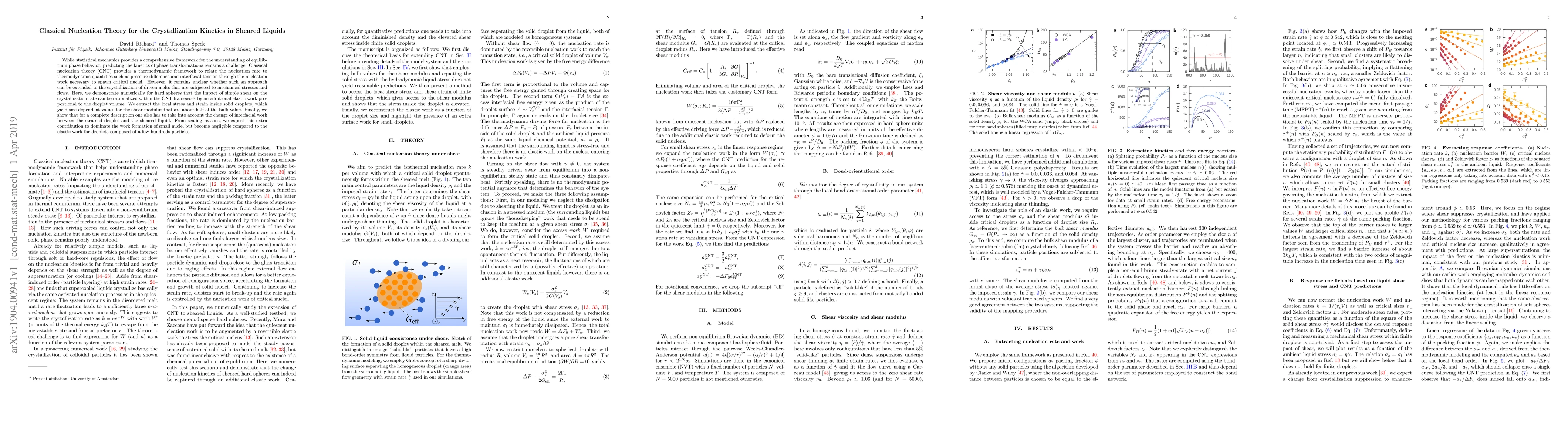 This paper extends classical nucleation theory to predict crystallization kinetics in sheared liquids, demonstrating that shear impacts the nucleation rate through an additional elastic work term. Numerical simulations on hard spheres show that local stress and strain modify the shear modulus, and the change in interfacial work becomes significant for small nuclei but diminishes for larger droplets.