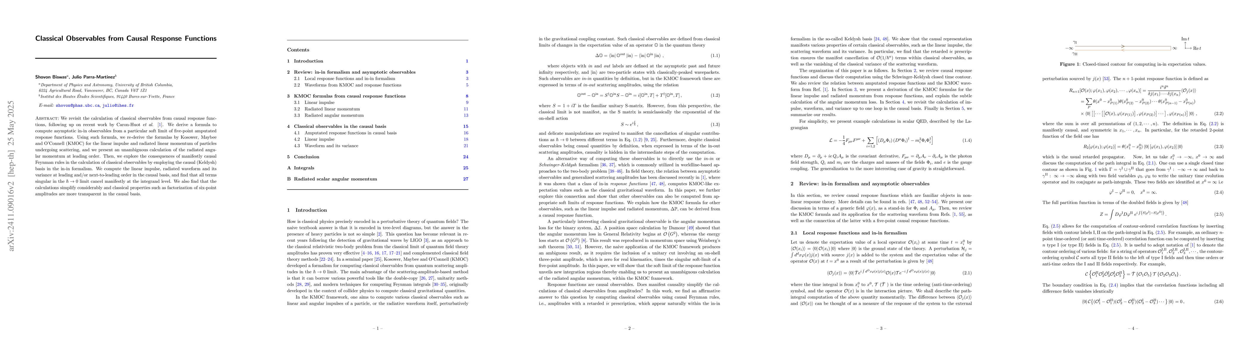 We revisit the calculation of classical observables from causal response functions, following up on recent work by Caron-Huot at al. [JHEP 01 (2024) 139]. We derive a formula to compute asymptotic in-in observables from a particular soft limit of five-point amputated response functions. Using such formula, we re-derive the formulas by Kosower, Maybee and O'Connell (KMOC) for the linear impulse and radiated linear momentum of particles undergoing scattering, and we present an unambiguous calculation of the radiated angular momentum at leading order. Then, we explore the consequences of manifestly causal Feynman rules in the calculation of classical observables by employing the causal (Keldysh) basis in the in-in formalism. We compute the linear impulse, radiated waveform and its variance at leading and/or next-to-leading order in the causal basis, and find that all terms singular in the $\hbar \to 0$ limit cancel manifestly at the integrand level. We also find that the calculations simplify considerably and classical properties such as factorization of six-point amplitudes are more transparent in the causal basis.