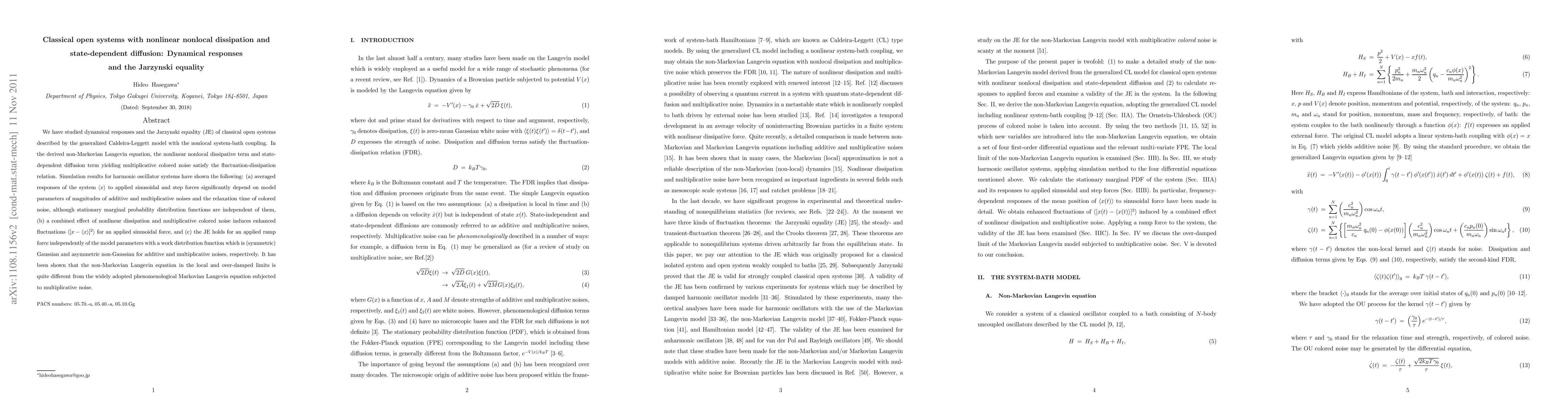 This paper investigates the dynamical responses and the Jarzynski equality in classical open systems with nonlinear nonlocal dissipation and state-dependent diffusion, revealing significant dependencies on noise magnitudes and relaxation times, enhanced fluctuations under sinusoidal forces, and the validity of the Jarzynski equality under ramp forces. The study contrasts the non-Markovian Langevin equation with the Markovian model.