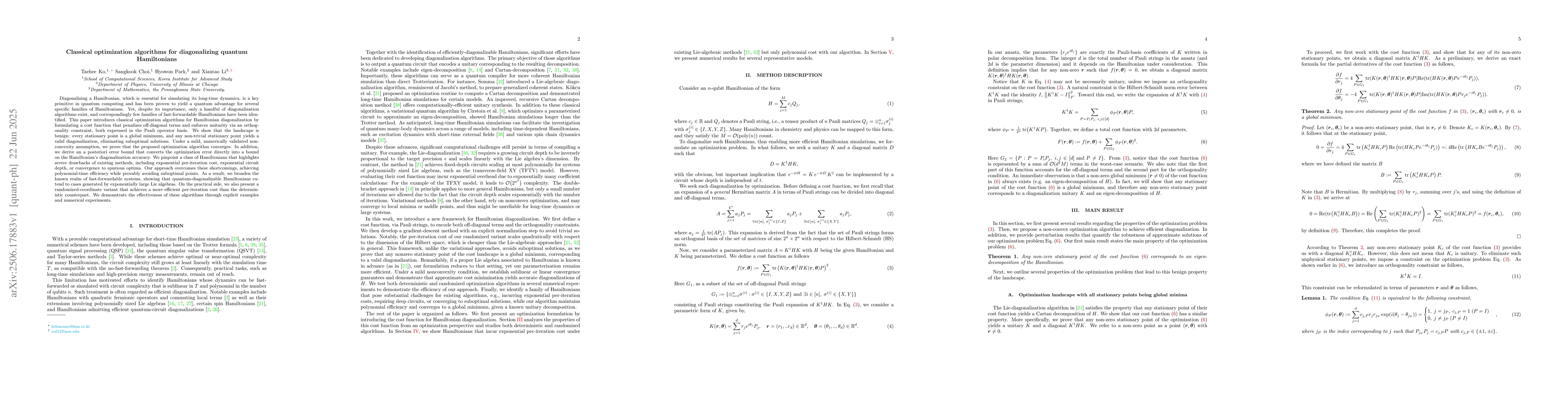 Diagonalizing a Hamiltonian, which is essential for simulating its long-time dynamics, is a key primitive in quantum computing and has been proven to yield a quantum advantage for several specific families of Hamiltonians. Yet, despite its importance, only a handful of diagonalization algorithms exist, and correspondingly few families of fast-forwardable Hamiltonians have been identified. This paper introduces classical optimization algorithms for Hamiltonian diagonalization by formulating a cost function that penalizes off-diagonal terms and enforces unitarity via an orthogonality constraint, both expressed in the Pauli operator basis. We pinpoint a class of Hamiltonians that highlights severe drawbacks of existing methods, including exponential per-iteration cost, exponential circuit depth, or convergence to spurious optima. Our approach overcomes these shortcomings, achieving polynomial-time efficiency while provably avoiding suboptimal points. As a result, we broaden the known realm of fast-forwardable systems, showing that quantum-diagonalizable Hamiltonians extend to cases generated by exponentially large Lie algebras. On the practical side, we also present a randomized-coordinate variant that achieves a more efficient per-iteration cost than the deterministic counterpart. We demonstrate the effectiveness of these algorithms through explicit examples and numerical experiments.