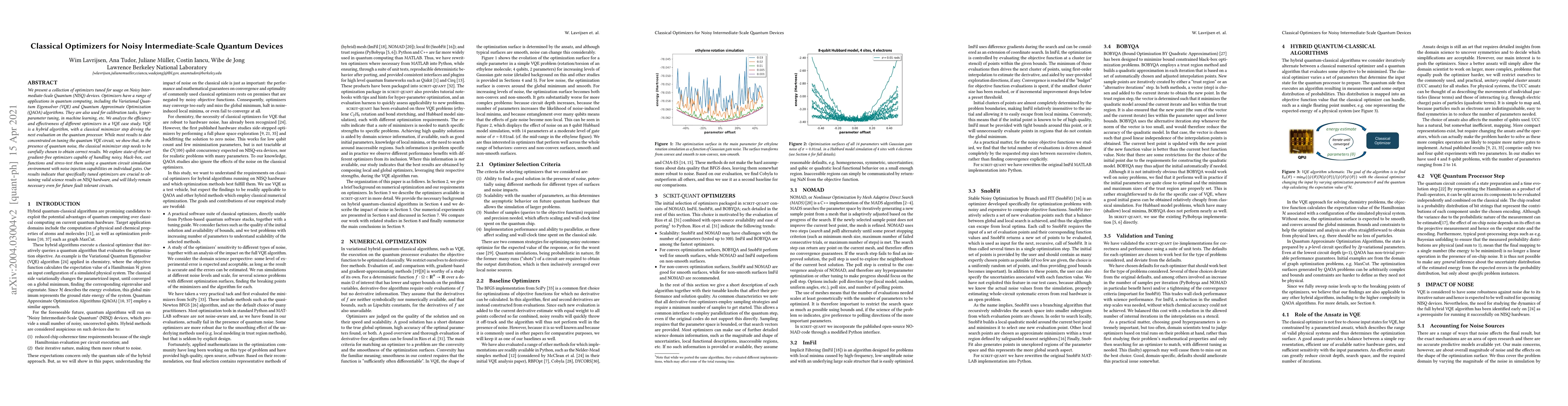 This paper investigates classical optimizers tailored for Noisy Intermediate-Scale Quantum (NISQ) devices, emphasizing their importance in the Variational Quantum Eigensolver (VQE) and Quantum Approximate Optimization Algorithm (QAOA) in noisy environments. It demonstrates that carefully selected classical minimizers are crucial for achieving accurate results despite quantum noise, highlighting the effectiveness of gradient-free optimizers in noisy, black-box cost function scenarios.