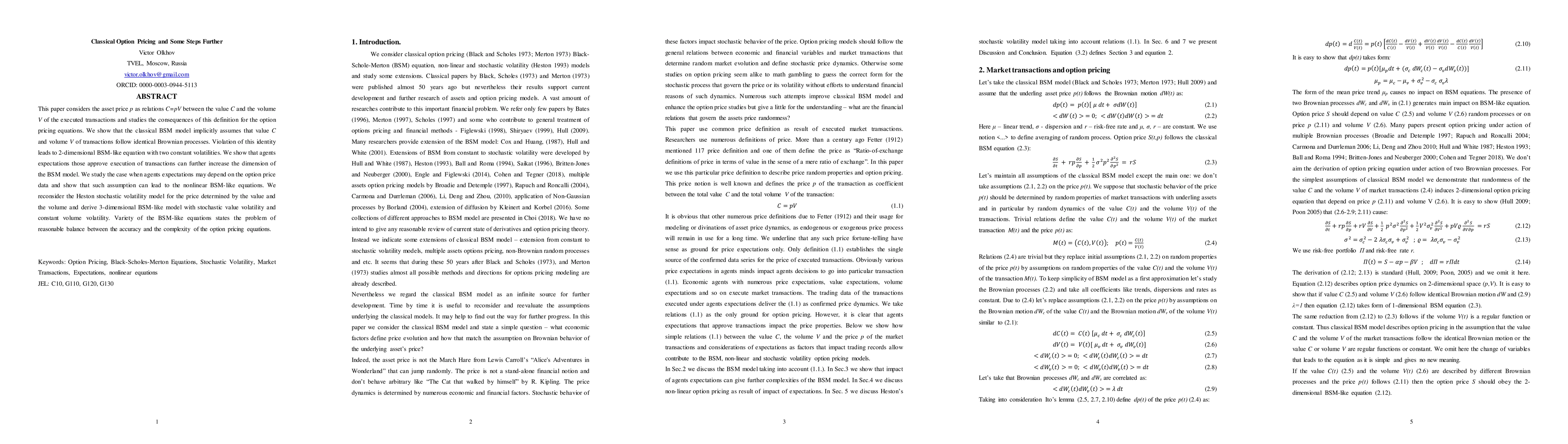 This paper considers the asset price p as relations C=pV between the value C and the volume V of the executed transactions and studies the consequences of this definition for the option pricing equations. We show that the classical BSM model implicitly assumes that value C and volume V of transactions follow identical Brownian processes. Violation of this identity leads to 2-dimensional BSM-like equation with two constant volatilities. We show that agents expectations those approve execution of transactions can further increase the dimension of the BSM model. We study the case when agents expectations may depend on the option price data and show that such assumption can lead to the nonlinear BSM-like equations. We reconsider the Heston stochastic volatility model for the price determined by the value and the volume and derive 3-dimensional BSM-like model with stochastic value volatility and constant volume volatility. Variety of the BSM-like equations states the problem of reasonable balance between the accuracy and the complexity of the option pricing equations.