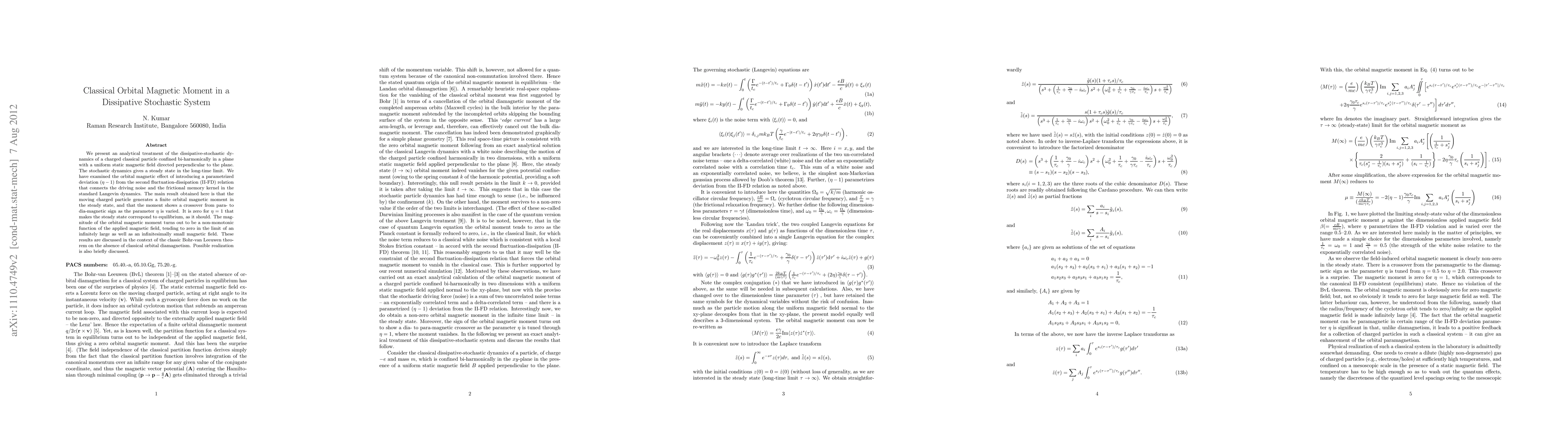 This paper analytically investigates the dissipative-stochastic dynamics of a charged particle in a magnetic field, revealing a finite orbital magnetic moment in steady state that transitions from para- to diamagnetic with a parameter variation. The study challenges the Bohr-van Leeuwen theorem by showing non-monotonic behavior of the moment with the magnetic field.