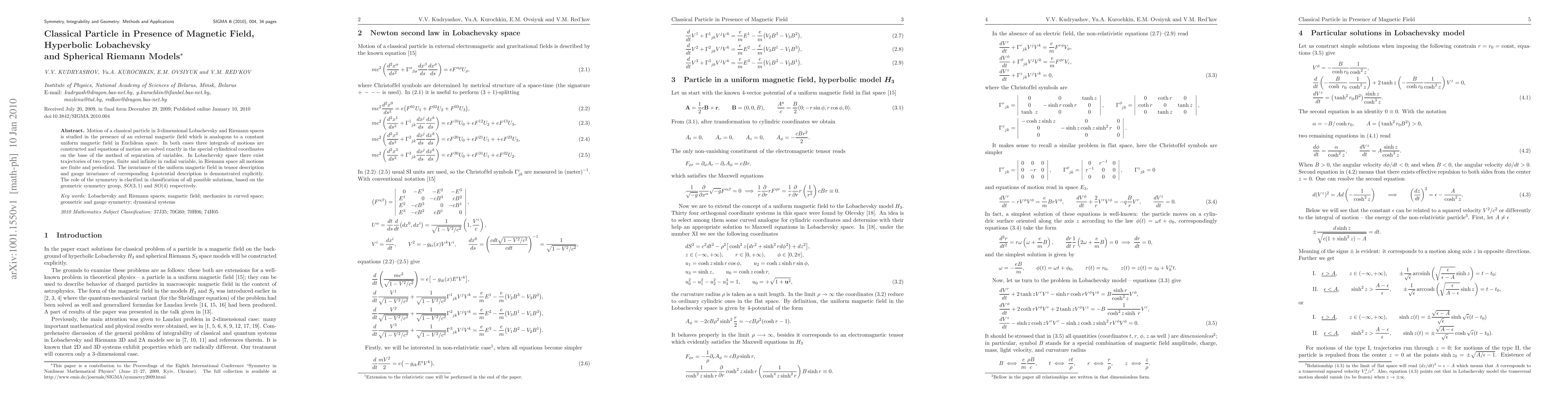 This paper studies the motion of a classical particle in Lobachevsky and Riemann spaces under an external magnetic field, solving the equations of motion exactly using separation of variables. It reveals distinct trajectory types in Lobachevsky space and finite, periodic motions in Riemann space, while demonstrating gauge invariance and the role of symmetry groups in classifying solutions.