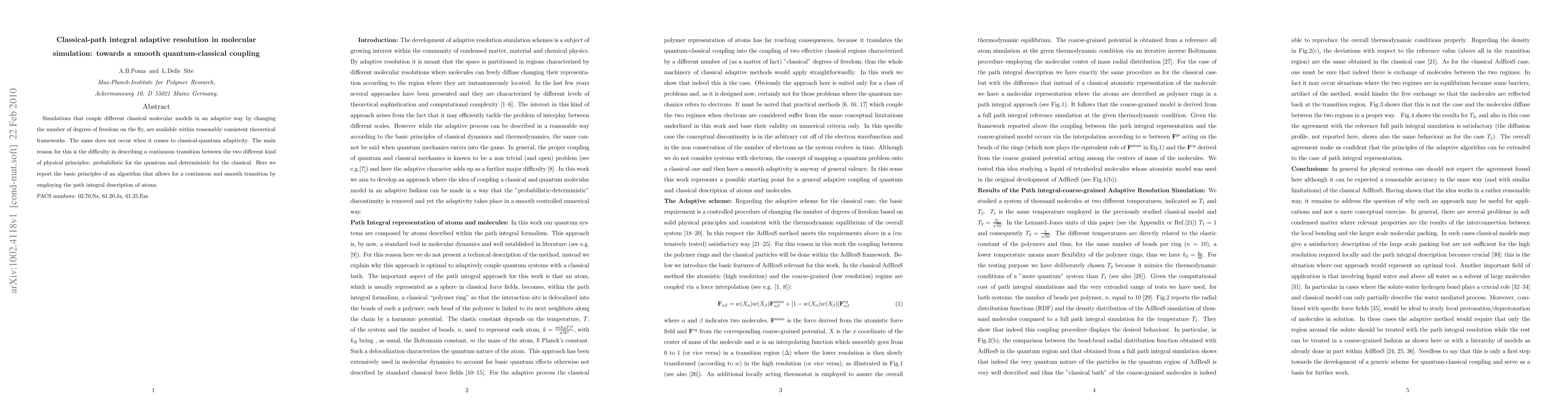 This research introduces an adaptive resolution method for molecular simulation that smoothly transitions between classical and quantum descriptions using path integral formalism, addressing the challenge of merging probabilistic quantum and deterministic classical principles.