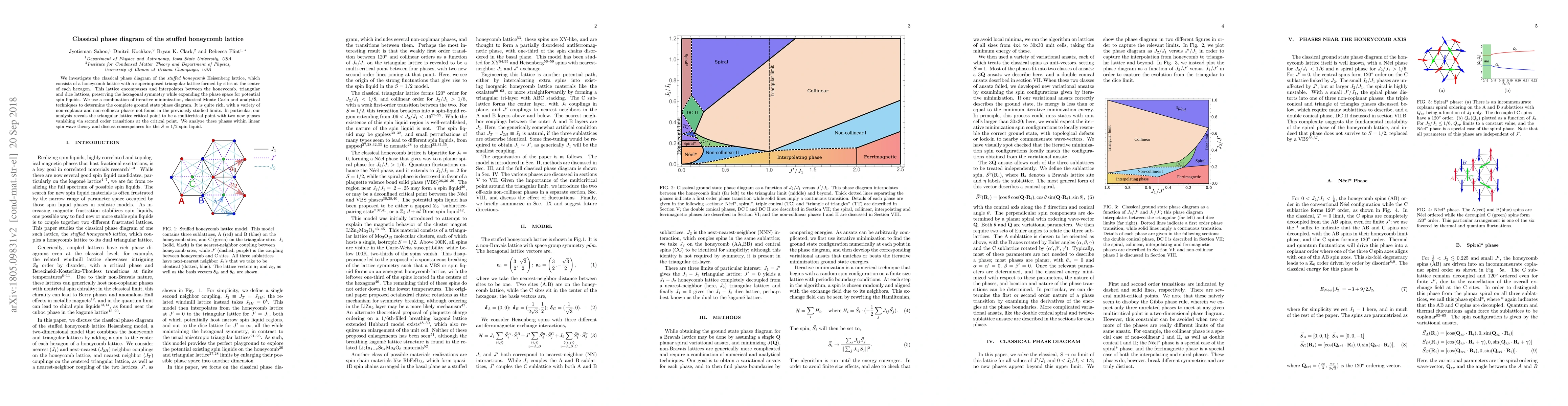 This paper explores the classical phase diagram of the stuffed honeycomb Heisenberg lattice, revealing a rich variety of non-coplanar and non-collinear phases. The study identifies a multicritical point at the triangular lattice, with two new phases emerging via second-order transitions, and discusses implications for S = 1/2 spin liquid formation.