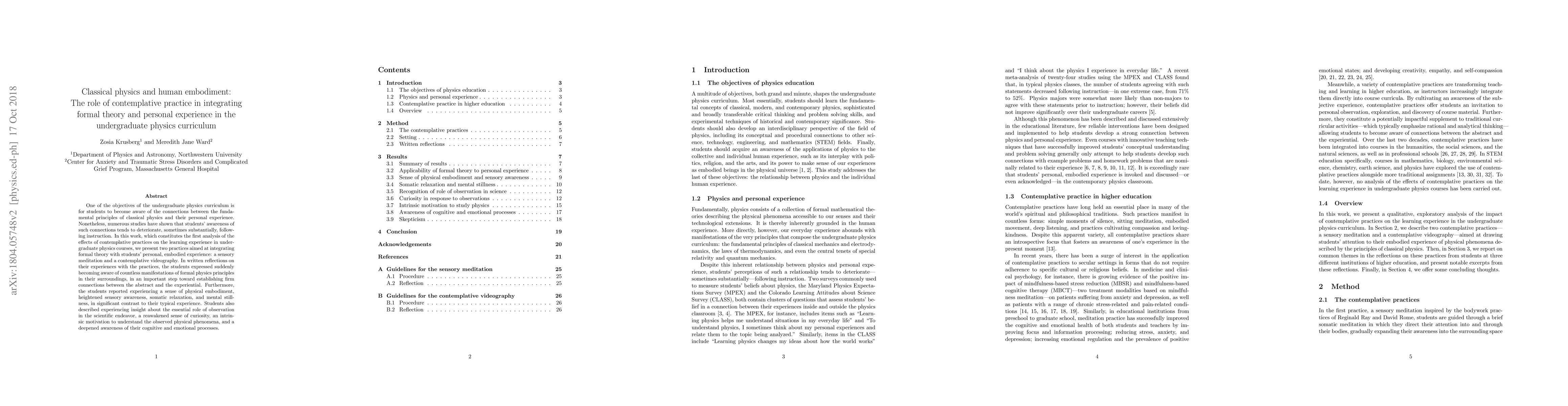 One of the objectives of the undergraduate physics curriculum is for students to become aware of the connections between the fundamental principles of classical physics and their personal experience. Nonetheless, numerous studies have shown that students' awareness of such connections tends to deteriorate, sometimes substantially, following instruction. In this work, which constitutes the first analysis of the effects of contemplative practices on the learning experience in undergraduate physics courses, we present two practices aimed at integrating formal theory with students' personal, embodied experience: a sensory meditation and a contemplative videography. In written reflections on their experiences with the practices, the students expressed suddenly becoming aware of countless manifestations of formal physics principles in their surroundings, in an important step toward establishing firm connections between the abstract and the experiential. Furthermore, the students reported experiencing a sense of physical embodiment, heightened sensory awareness, somatic relaxation, and mental stillness, in significant contrast to their typical experience. Students also described experiencing insight about the essential role of observation in the scientific endeavor, a reawakened sense of curiosity, an intrinsic motivation to understand the observed physical phenomena, and a deepened awareness of their cognitive and emotional processes.
