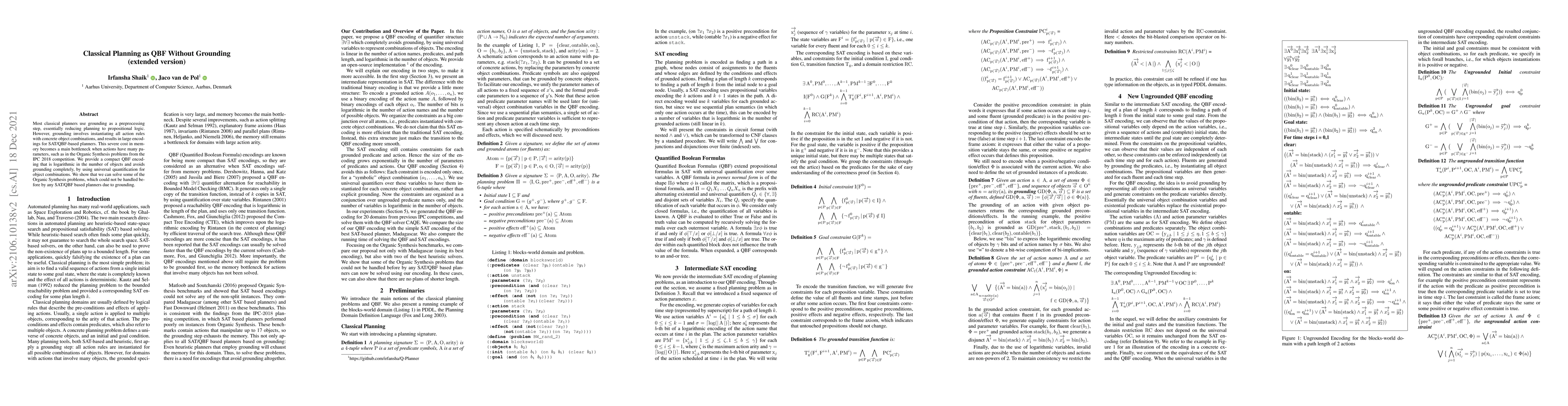This paper proposes a QBF encoding for classical planning that avoids grounding, using universal quantification instead, resulting in a compact representation that is logarithmic in the number of objects. This method enables SAT/QBF-based planners to solve Organic Synthesis problems previously intractable due to the memory costs of grounding.