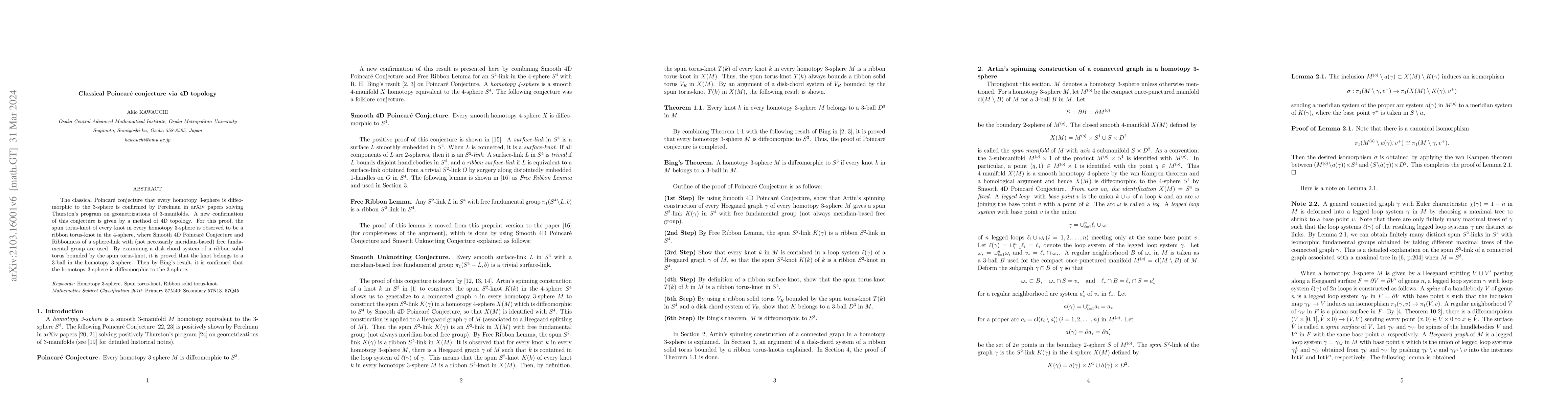 The classical Poincar{\'e} conjecture that every homotopy 3-sphere is diffeomorphic to the 3-sphere is confirmed by Perelman in arXiv papers solving Thurston's program on geometrizations of 3-manifolds. A new confirmation of this conjecture is given by a method of 4D topology. For this proof, the spun torus-knot of every knot in every homotopy 3-sphere is observed to be a ribbon torus-knot in the 4-sphere, where Smooth 4D Poincar{\'e} Conjecture and Ribbonness of a sphere-link with (not necessarily meridian-based) free fundamental group are used. By examining a disk-chord system of a ribbon solid torus bounded by the spun torus-knot,it is proved that the knot belongs to a 3-ball in the homotopy 3-sphere. Then by Bing's result, it is confirmed that the homotopy 3-sphere is diffeomorphic to the 3-sphere.