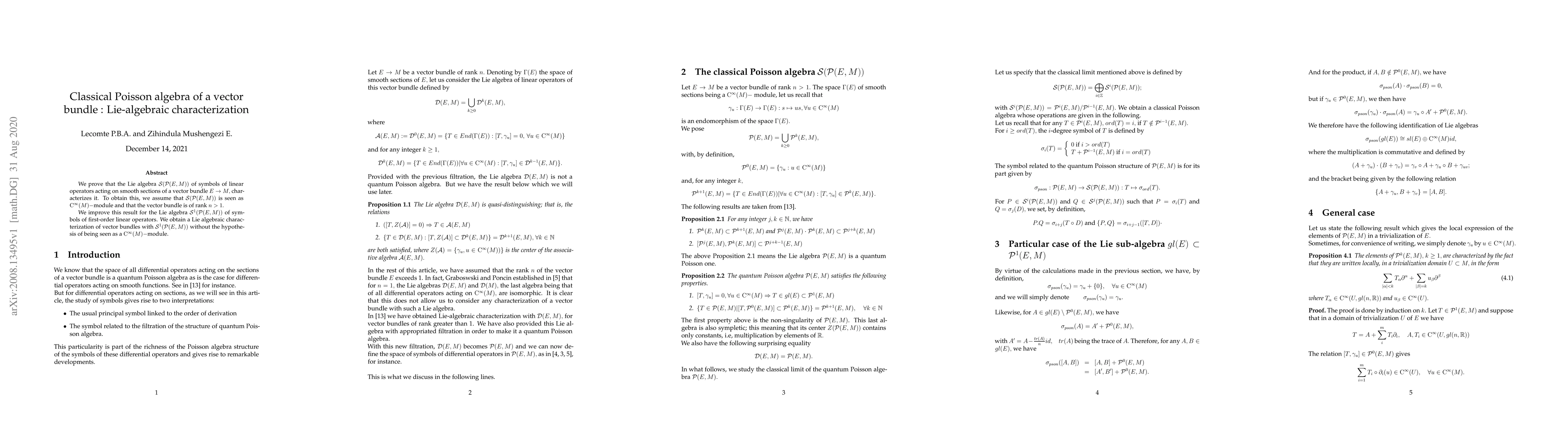 This paper proves that the Lie algebra of symbols of linear operators on smooth sections of a vector bundle characterizes the bundle, especially focusing on first-order operators. It extends this characterization without requiring the module assumption for first-order operator symbols.