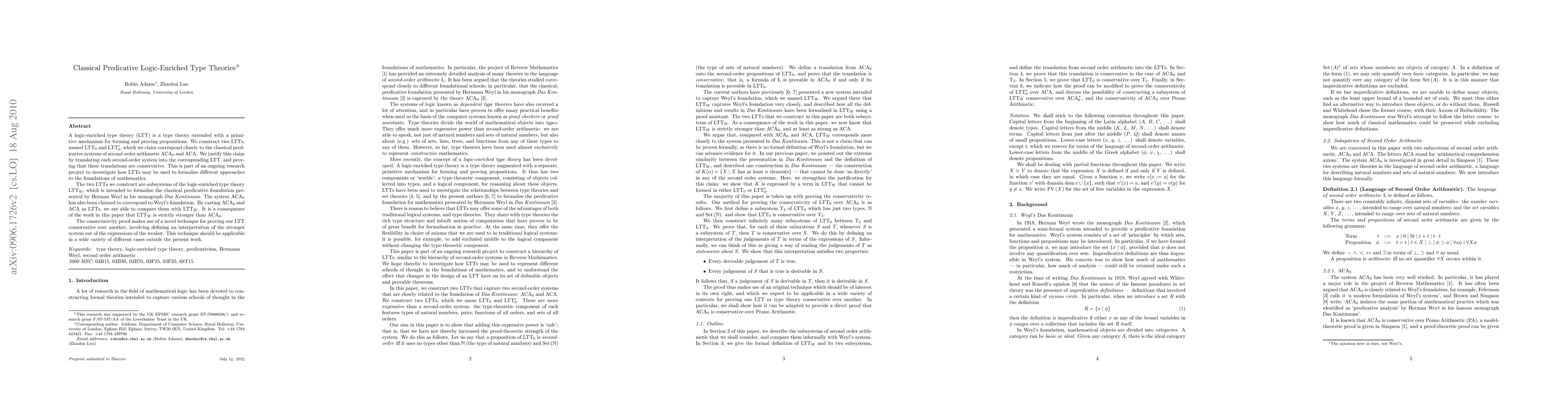 This paper constructs two logic-enriched type theories, LTTO and LTTO*, corresponding to classical predicative systems ACAO and ACA, and proves their translations are conservative. It shows LTTW, a broader foundational system, is strictly stronger than ACAO. The conservativity proof introduces a novel technique for interpreting stronger systems within weaker ones.