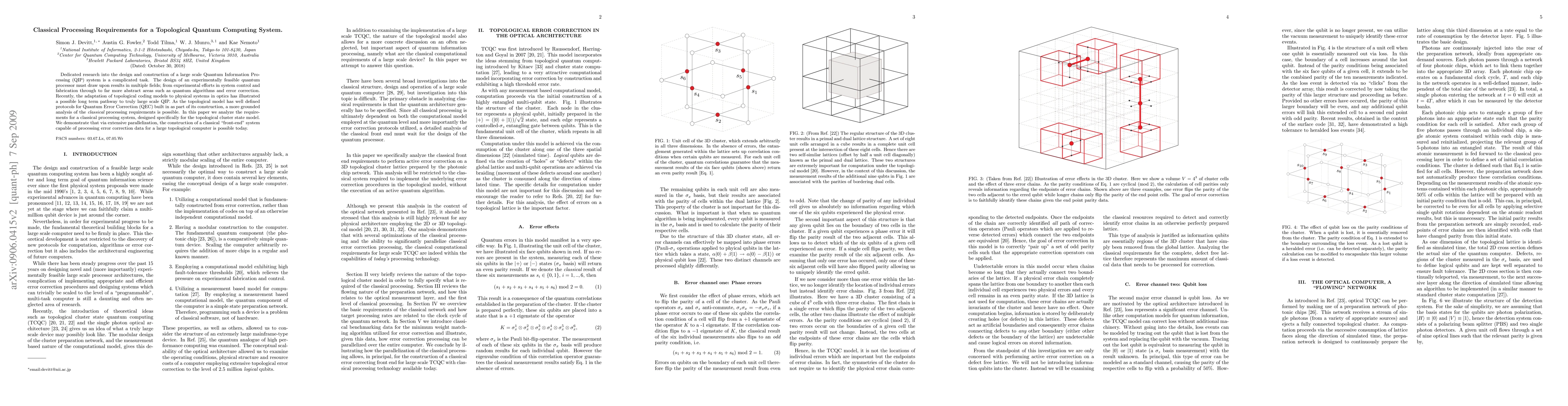 Dedicated research into the design and construction of a large scale Quantum Information Processing (QIP) system is a complicated task. The design of an experimentally feasible quantum processor must draw upon results in multiple fields; from experimental efforts in system control and fabrication through to far more abstract areas such as quantum algorithms and error correction. Recently, the adaptation of topological coding models to physical systems in optics has illustrated a possible long term pathway to truly large scale QIP. As the topological model has well defined protocols for Quantum Error Correction (QEC) built in as part of its construction, a more grounded analysis of the {\em classical} processing requirements is possible. In this paper we analyze the requirements for a classical processing system, designed specifically for the topological cluster state model. We demonstrate that via extensive parallelization, the construction of a classical "front-end" system capable of processing error correction data for a large topological computer is possible today.