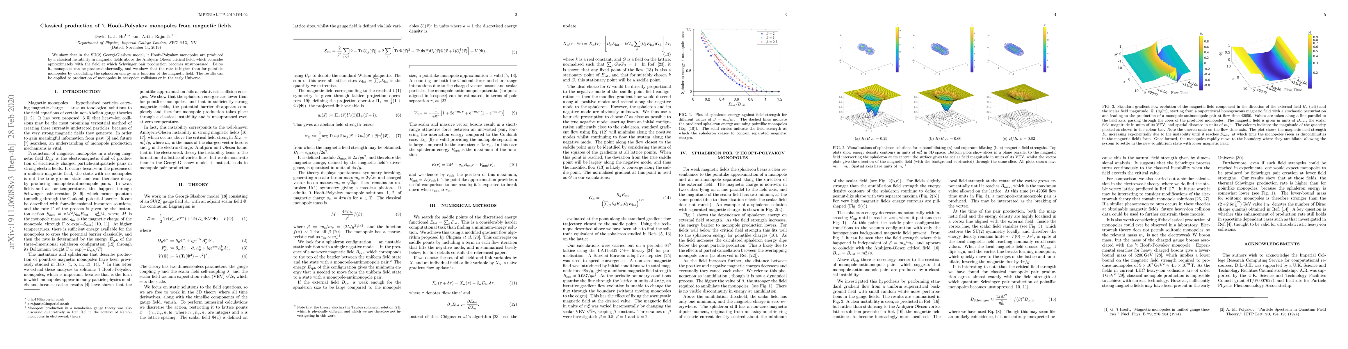 Summary: The paper demonstrates that 't Hooft-Polyakov monopoles in the SU(2) Georgi-Glashow model emerge from classical instabilities in magnetic fields surpassing the Ambjern-Olesen critical field, coinciding with the onset of unsuppressed Schwinger pair production. It also calculates that thermal production rates are higher than for pointlike monopoles, relevant for scenarios like heavy-ion collisions and the early Universe.