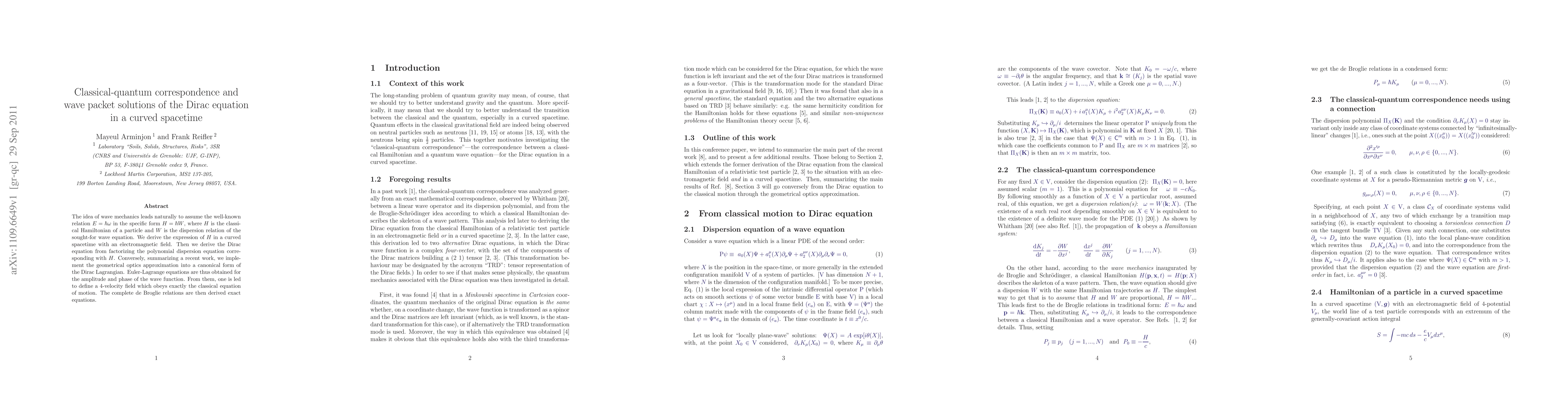 The idea of wave mechanics leads naturally to assume the well-known relation $E=\hbar \omega $ in the specific form $H=\hbar W$, where $H$ is the classical Hamiltonian of a particle and $W$ is the dispersion relation of the sought-for wave equation. We derive the expression of $H$ in a curved spacetime with an electromagnetic field. Then we derive the Dirac equation from factorizing the polynomial dispersion equation corresponding with $H$. Conversely, summarizing a recent work, we implement the geometrical optics approximation into a canonical form of the Dirac Lagrangian. Euler-Lagrange equations are thus obtained for the amplitude and phase of the wave function. From them, one is led to define a 4-velocity field which obeys exactly the classical equation of motion. The complete de Broglie relations are then derived exact equations.