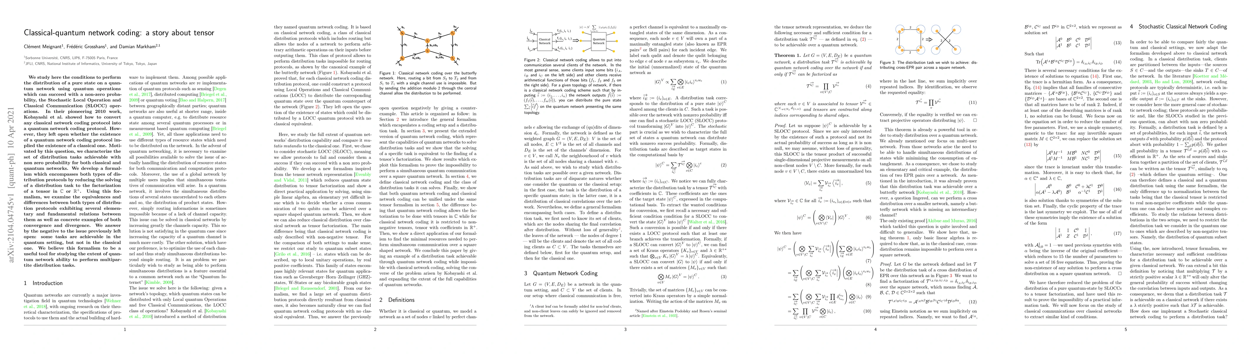 We study here the conditions to perform the distribution of a pure state on a quantum network using quantum operations which can succeed with a non-zero probability, the Stochastic Local Operation and Classical Communication (SLOCC) operations. In their pioneering 2010 work, Kobayashi et al. showed how to convert any classical network coding protocol into a quantum network coding protocol. However, they left open whether the existence of a quantum network coding protocol implied the existence of a classical one. Motivated by this question, we characterize the set of distribution tasks achievable with non zero probability for both classical and quantum networks. We develop a formalism which encompasses both types of distribution protocols by reducing the solving of a distribution task to the factorization of a tensor with complex coefficients or real positive ones. Using this formalism, we examine the equivalences and differences between both types of distribution protocols exhibiting several elementary and fundamental relations between them as well as concrete examples of both convergence and divergence. We answer by the negative to the issue previously left open: some tasks are achievable in the quantum setting, but not in the classical one. We believe this formalism to be a useful tool for studying the extent of quantum network ability to perform multipartite distribution tasks.
