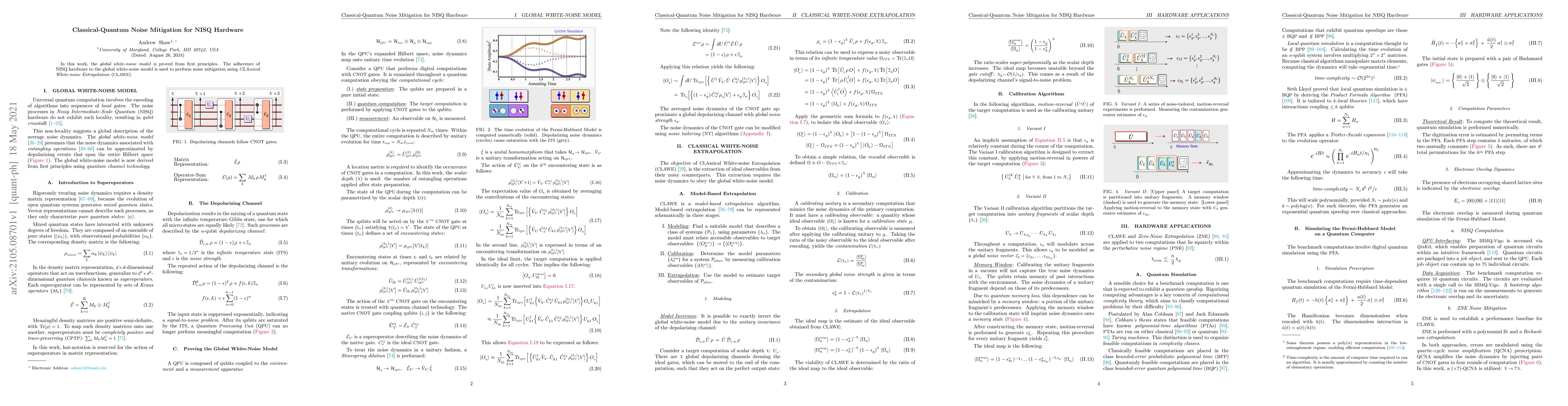 This paper proves the global white-noise model from first principles and applies it to mitigate noise in NISQ hardware, utilizing Classical White-noise Extrapolation (CLAWE) for effective noise reduction.