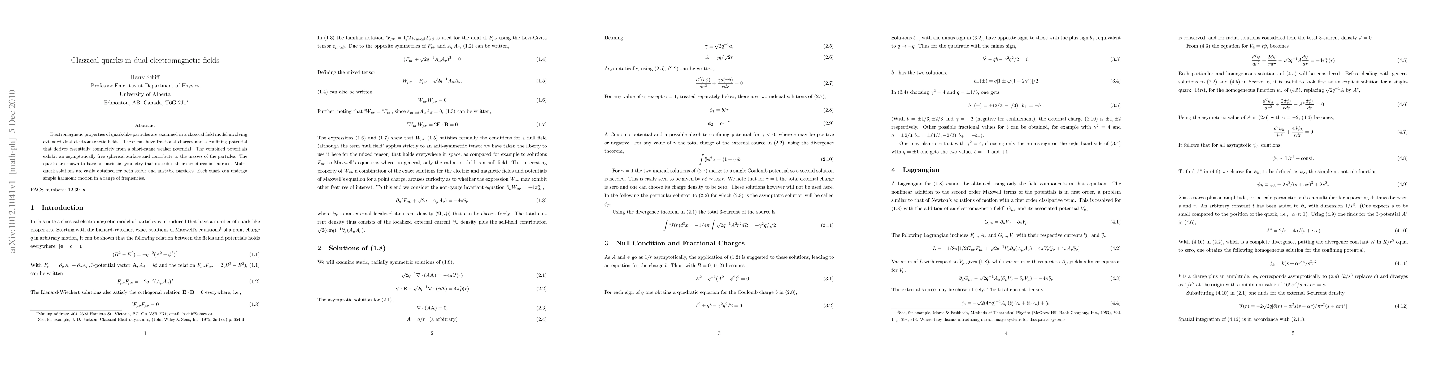 Electromagnetic properties of quark-like particles are examined in a classical field model involving extended dual electromagnetic fields. These can have fractional charges and a confining potential that derives essentially completely from a short-range weaker potential. The combined potentials exhibit an asymptotically free spherical surface and contribute to the masses of the particles. The quarks are shown to have an intrinsic symmetry that describes their structures in hadrons. Multi- quark solutions are easily obtained for both stable and unstable particles. Each quark can undergo simple harmonic motion in a range of frequencies.