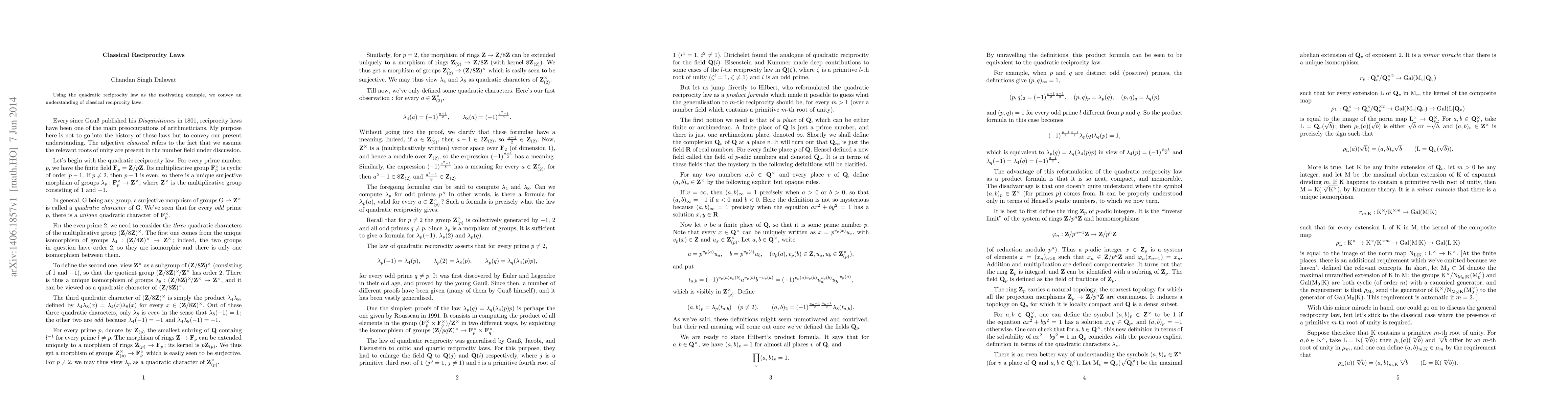 Summary: This paper explores classical reciprocity laws, primarily through the lens of the quadratic reciprocity law, to elucidate their fundamental principles and significance in number theory.