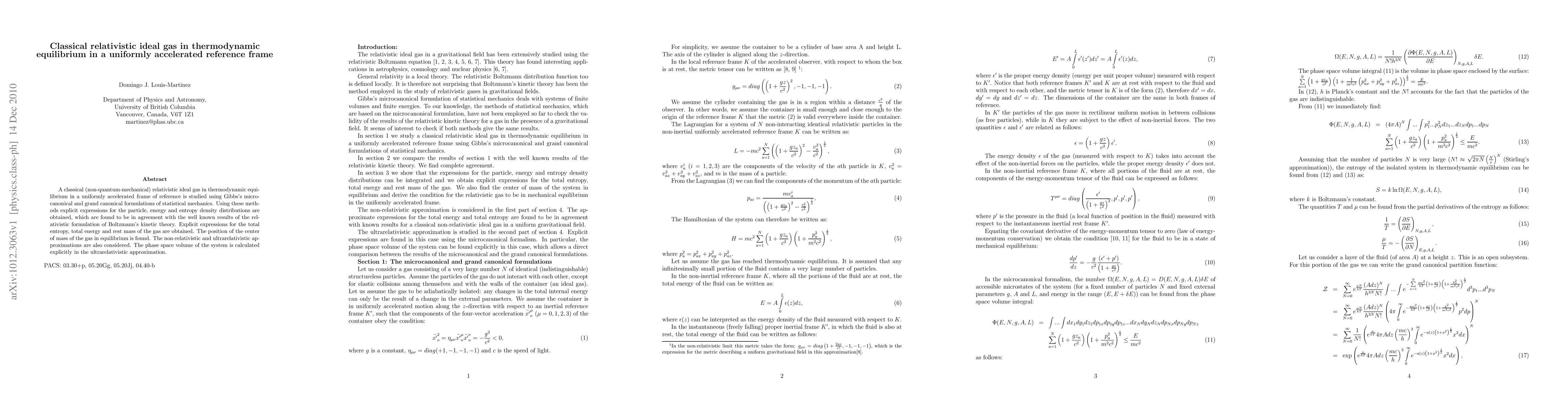 A classical (non-quantum-mechanical) relativistic ideal gas in thermodynamic equilibrium in a uniformly accelerated frame of reference is studied using Gibbs's microcanonical and grand canonical formulations of statistical mechanics. Using these methods explicit expressions for the particle, energy and entropy density distributions are obtained, which are found to be in agreement with the well known results of the relativistic formulation of Boltzmann's kinetic theory. Explicit expressions for the total entropy, total energy and rest mass of the gas are obtained. The position of the center of mass of the gas in equilibrium is found. The non-relativistic and ultrarelativistic approximations are also considered. The phase space volume of the system is calculated explicitly in the ultrarelativistic approximation.