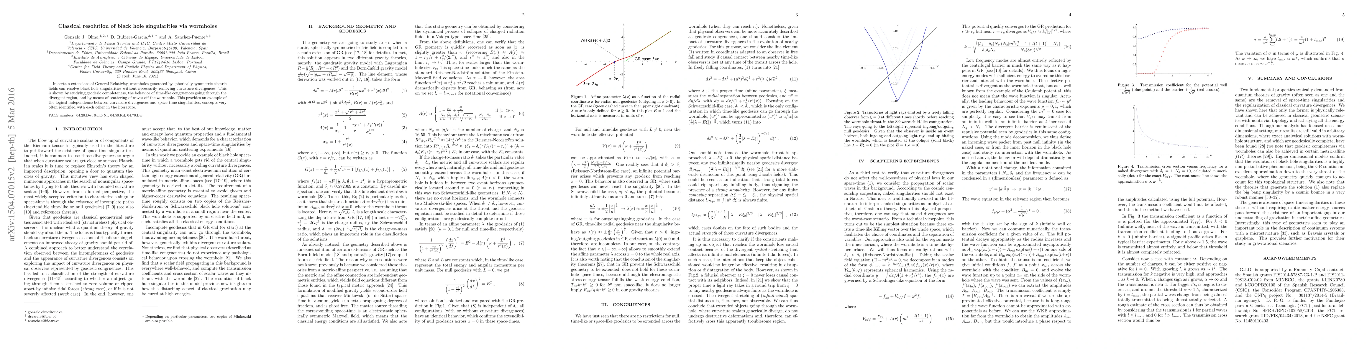 This paper demonstrates that wormholes generated by spherically symmetric electric fields in extended General Relativity can resolve black hole singularities, showing geodesic completeness and wave scattering behavior, thus illustrating the distinction between curvature divergences and space-time singularities.